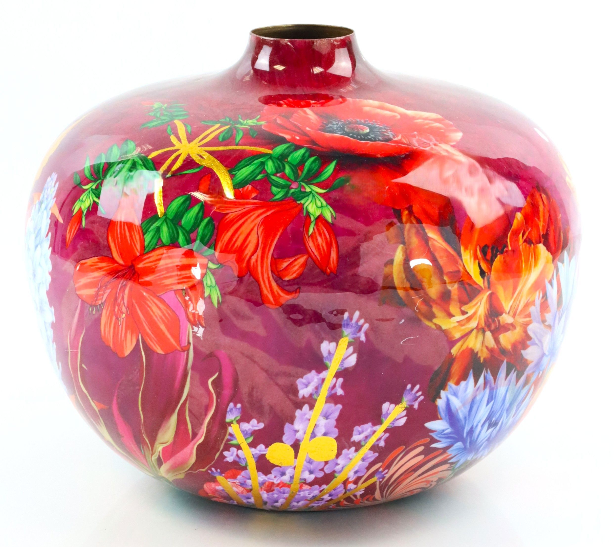 Entdecken Sie die künstlerische Anmutung der "Vase Eden Bloom", die Ihrem Interieur im Frühling und Sommer eine frische Note verleiht. Diese exquisite Vase, Artikelnummer 3548, besteht aus hochwertigem emaillierten Eisen und beeindruckt durch ein einzigartiges Design mit roten Blumenmustern. Mit einer Höhe von ca. 27 cm ist sie das perfekte Dekorelement für jeden Raum, sei es ein modernes Wohnzimmer, ein stilvolles Geschäft oder ein trendbewusstes Café.