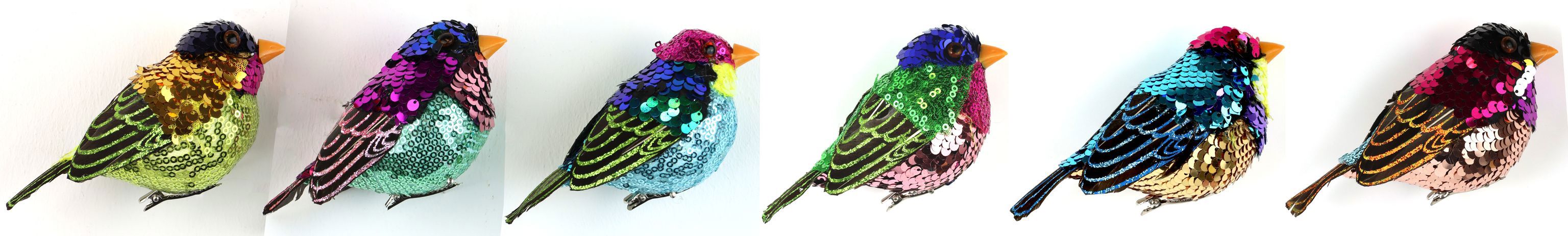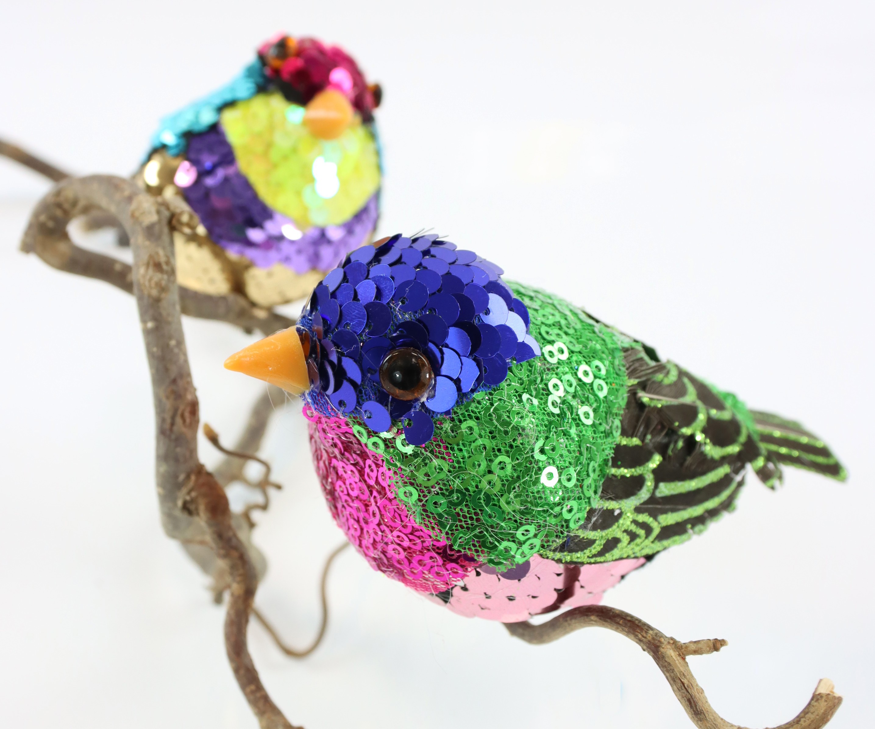Jeder der Vögel misst ca. 12 cm und ist mit Liebe zum Detail gestaltet, um ein lebendiges und faszinierendes Dekorationselement zu bieten. Die glitzernden Pailletten reflektieren das Licht auf beeindruckende Weise und schaffen somit eine lebendige Atmosphäre, die perfekt zum Frühling und Sommer passt. Lassen Sie Ihre Kunden in eine Welt voller Farben und strahlender Details eintauchen, die sowohl drinnen als auch draußen eine herausragende Wirkung entfalten.