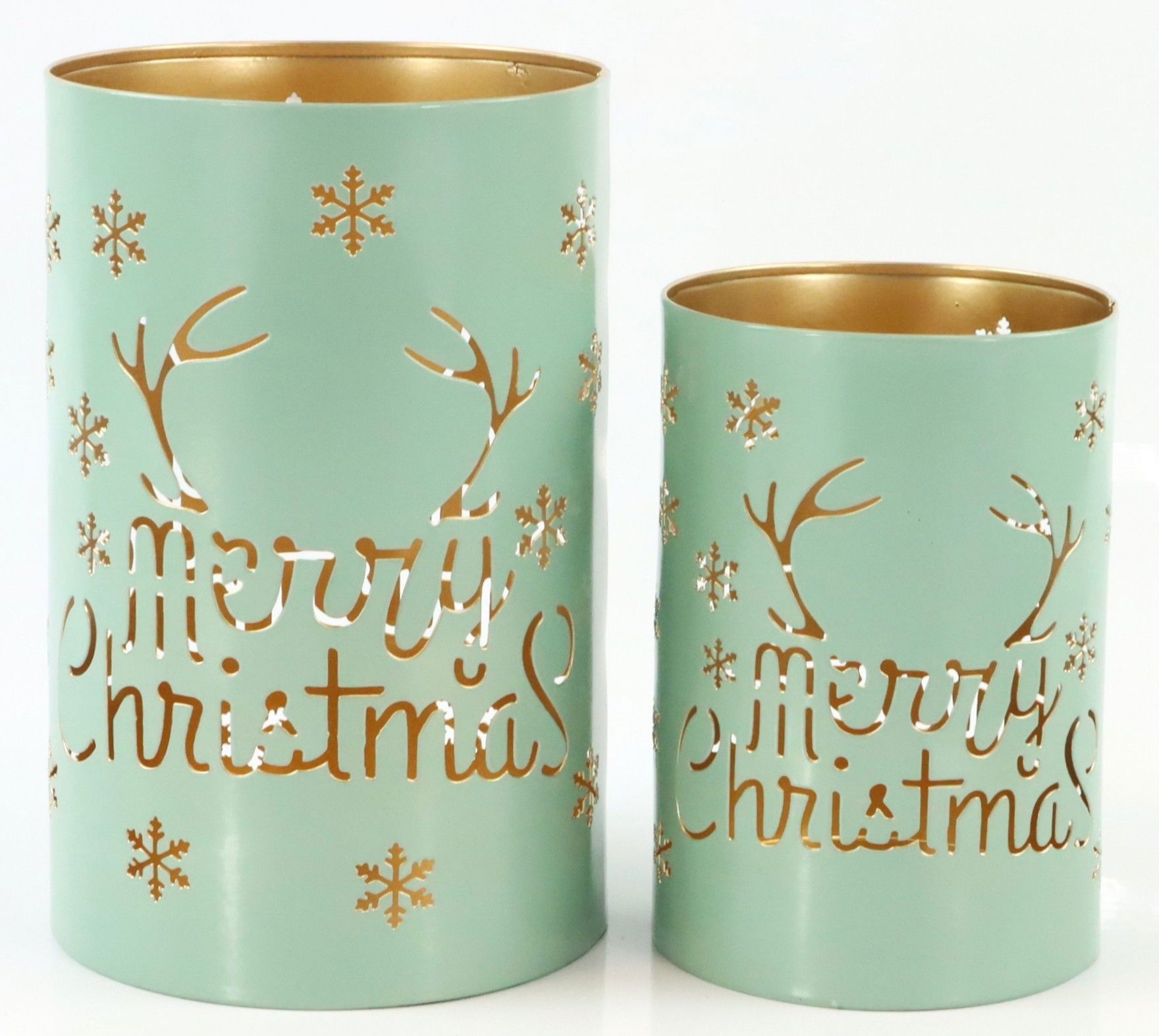 - Windlichter-Set aus hochwertigem Metall mit Schriftzug "Merry Christmas" in mint und gold