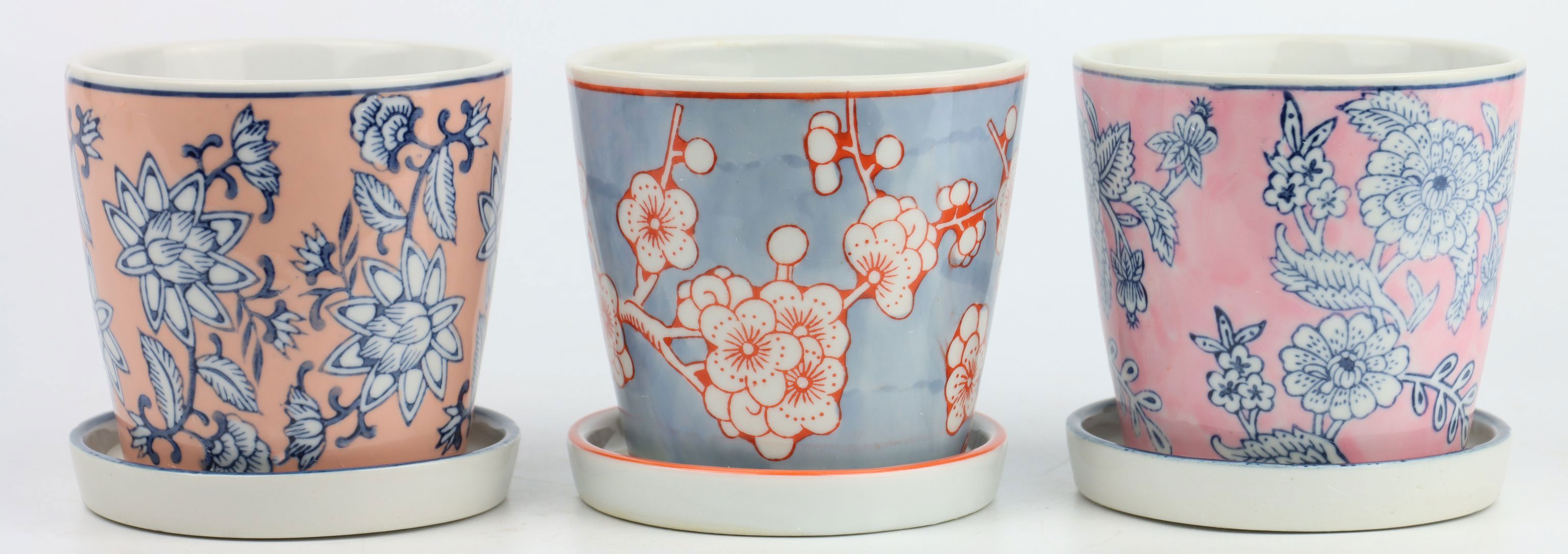 Entdecken Sie das exquisite 3-teilige Set der Übertöpfe "MING" mit Teller, das Ihrem Wohn- und Lifestyle-Sortiment eine einzigartige Note verleiht. Dieses hochwertige Set bringt nicht nur funktionale Vorteile, sondern auch einen Hauch fernöstlicher Eleganz in Ihre Geschäftsräume. Gefertigt aus feinstem Porzellan, bestechen die Übertöpfe durch ihre anmutigen Farben in zartem Rosa und Hellblau, die mit kunstvoll gestalteten Blumenmotiven verziert sind. Mit einer Höhe von ca. 11 cm sind sie die perfekte Ergänzung für jedes Wohnambiente und laden Ihre Kundschaft ein, ihre Pflanzen elegant zur Schau zu stellen.