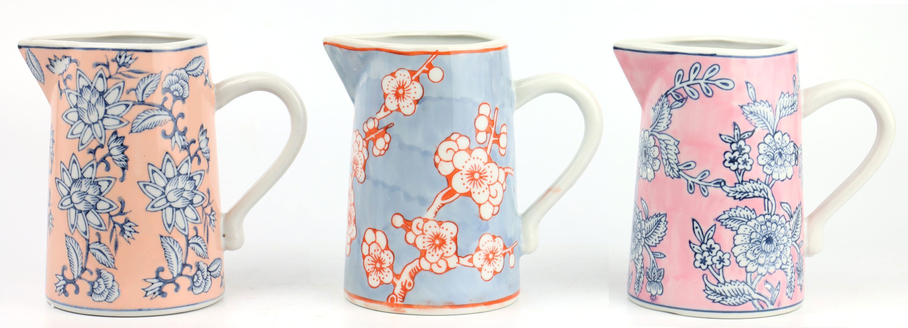 Die drei Krüge, die jeweils eine Höhe von etwa 15 cm aufweisen, strahlen in zarten Rosa- und Hellblautönen. Ihr elegantes Design wird durch zarte Blumenmotive ergänzt, die kunstvoll auf die Oberfläche der Krüge aufgetragen sind. Diese harmonische Farb- und Musterkombination macht das Krüge "MING" Set zu einem idealen Dekorationselement für Küchen, Wohnzimmer oder Essbereiche. Die Krüge sind nicht nur ein dekoratives Highlight, sondern auch praktisch einsetzbar, beispielsweise als Vase oder eindrucksvoller Aufbewahrungsort für Küchenutensilien.