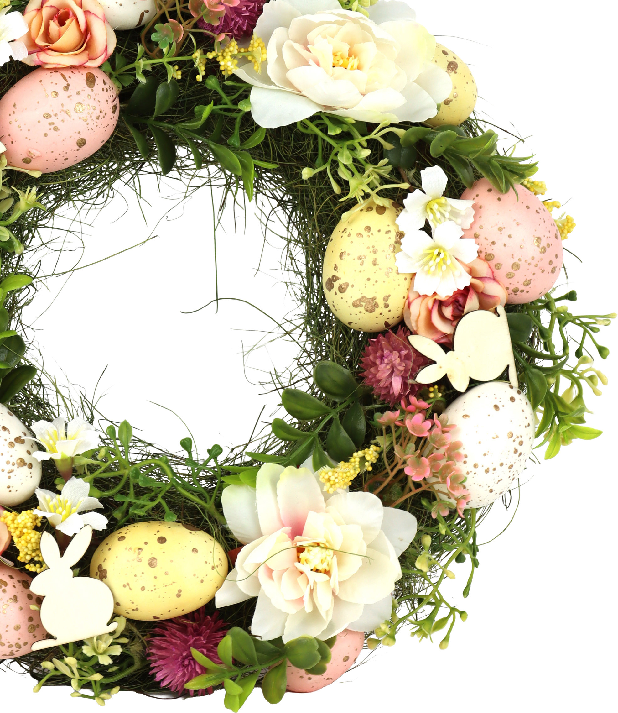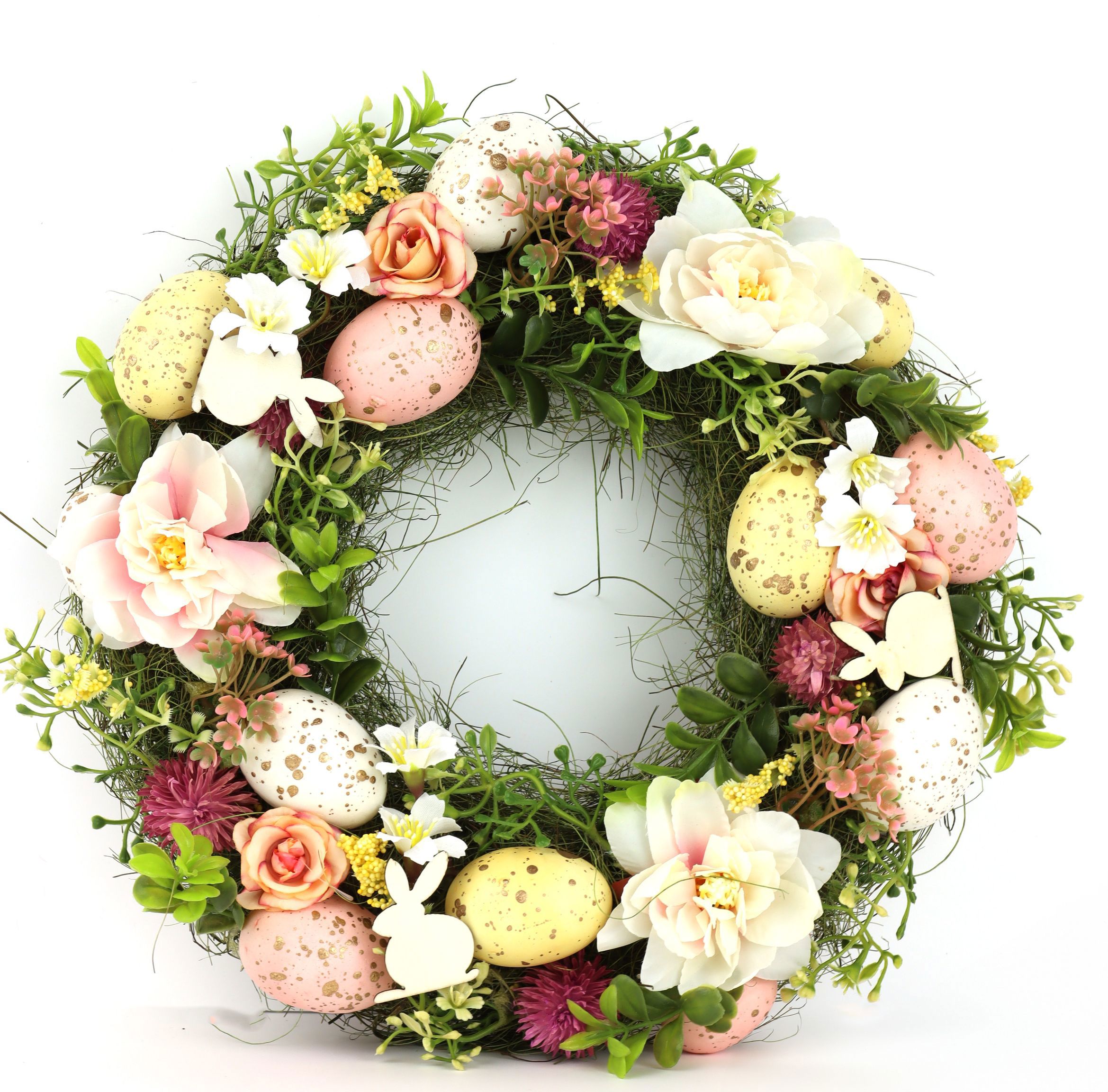 Der Osterkranz "Easter Blossom" lässt sich wunderbar mit anderen Osterartikeln kombinieren und bietet dadurch vielfältige Dekorationsmöglichkeiten. Platzieren Sie ihn zum Beispiel mit passenden Kerzen oder anderen Frühlingsblumen, um ein harmonisches und einladendes Ambiente zu schaffen, das Ihre Kunden begeistert und inspiriert.