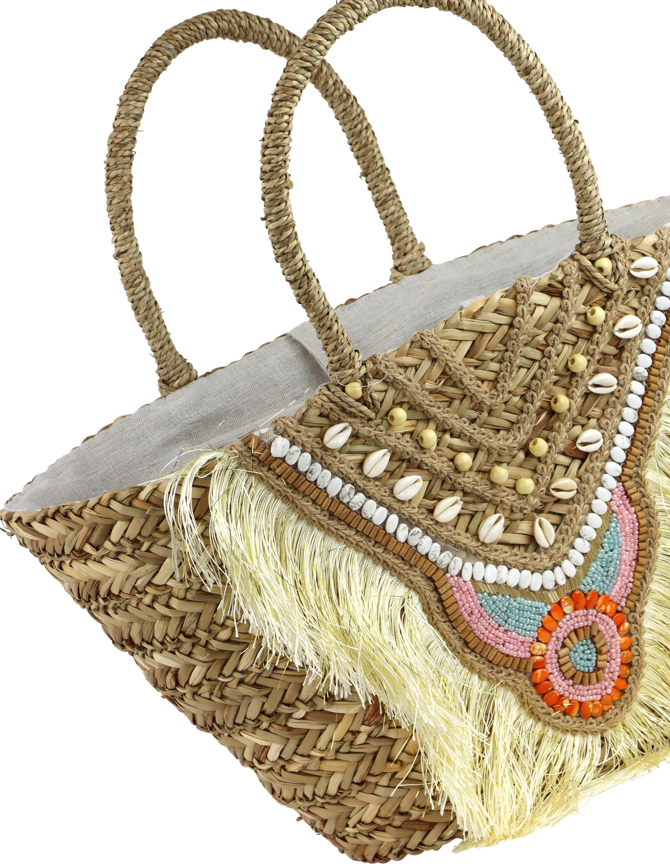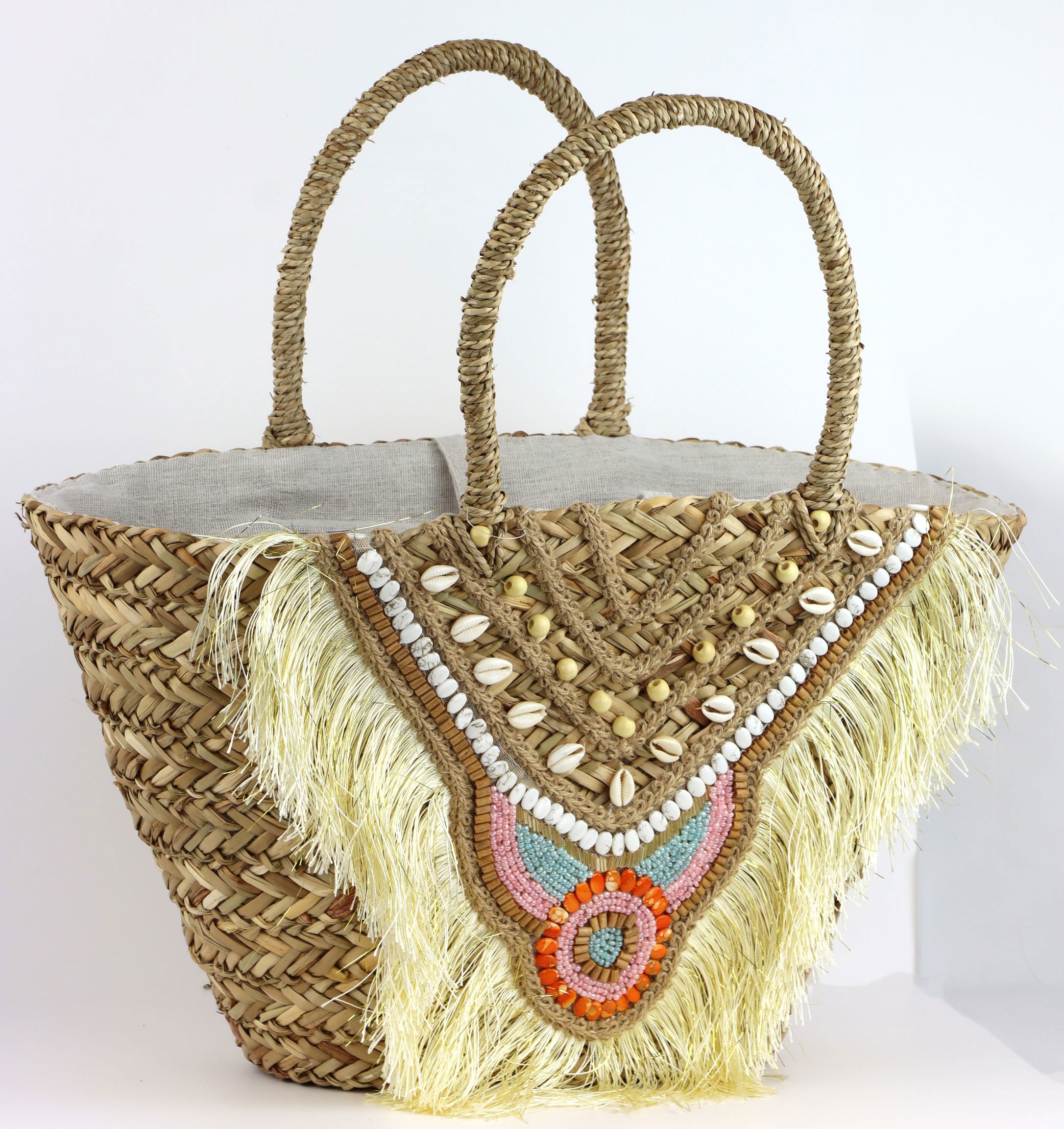Entdecken Sie die bezaubernde Korbtasche "Gypsy Glow", die ein Must-Have für die Frühjahr/Sommer-Saison darstellt! Diese trendige Tasche vereint gekonnt natürliche Materialien und modernes Design, sodass sie sich perfekt für den stilbewussten Einzelhändler eignet, der seinen Kunden etwas Besonderes bieten möchte. Gefertigt aus hochwertigem Seegras, strapazierfähigem Jeansstoff und fein geflochtenem Raffia, überzeugt diese Tasche durch ihre Langlebigkeit und ihren einzigartigen Boho-Look. Mit einer großzügigen Größe von ca. 50 cm bietet sie ausreichend Platz für alle wichtigen Utensilien, die man für einen sonnigen Nachmittag im Park oder einen entspannten Tag am Strand benötigt.