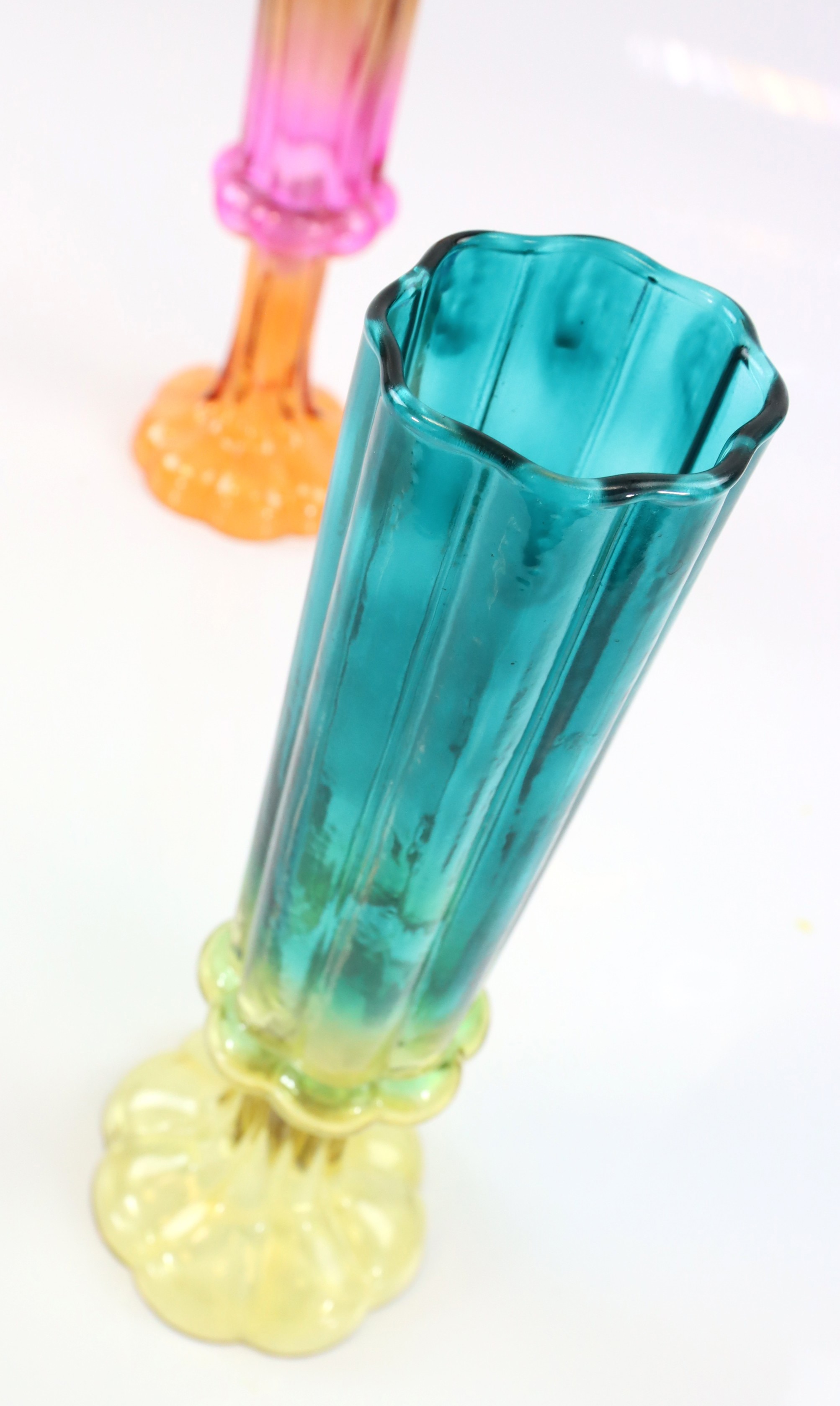 Das Vasenset "Sunset Glow" besticht durch sein beeindruckendes Ombre-Design, das einen sanften Farbverlauf von warmen Orange- und Gelbtönen bis hin zu einem tiefen, beruhigenden Blau zeigt. Diese Farbkomposition schafft es, die lebendige Schönheit eines Sonnenuntergangs direkt in Ihr Zuhause zu bringen. Jedes Stück aus diesem Trio ist ein handgefertigtes Kunstwerk aus hochwertigem Glas, das sowohl einzeln als auch in Kombination ein echter Blickfang ist.