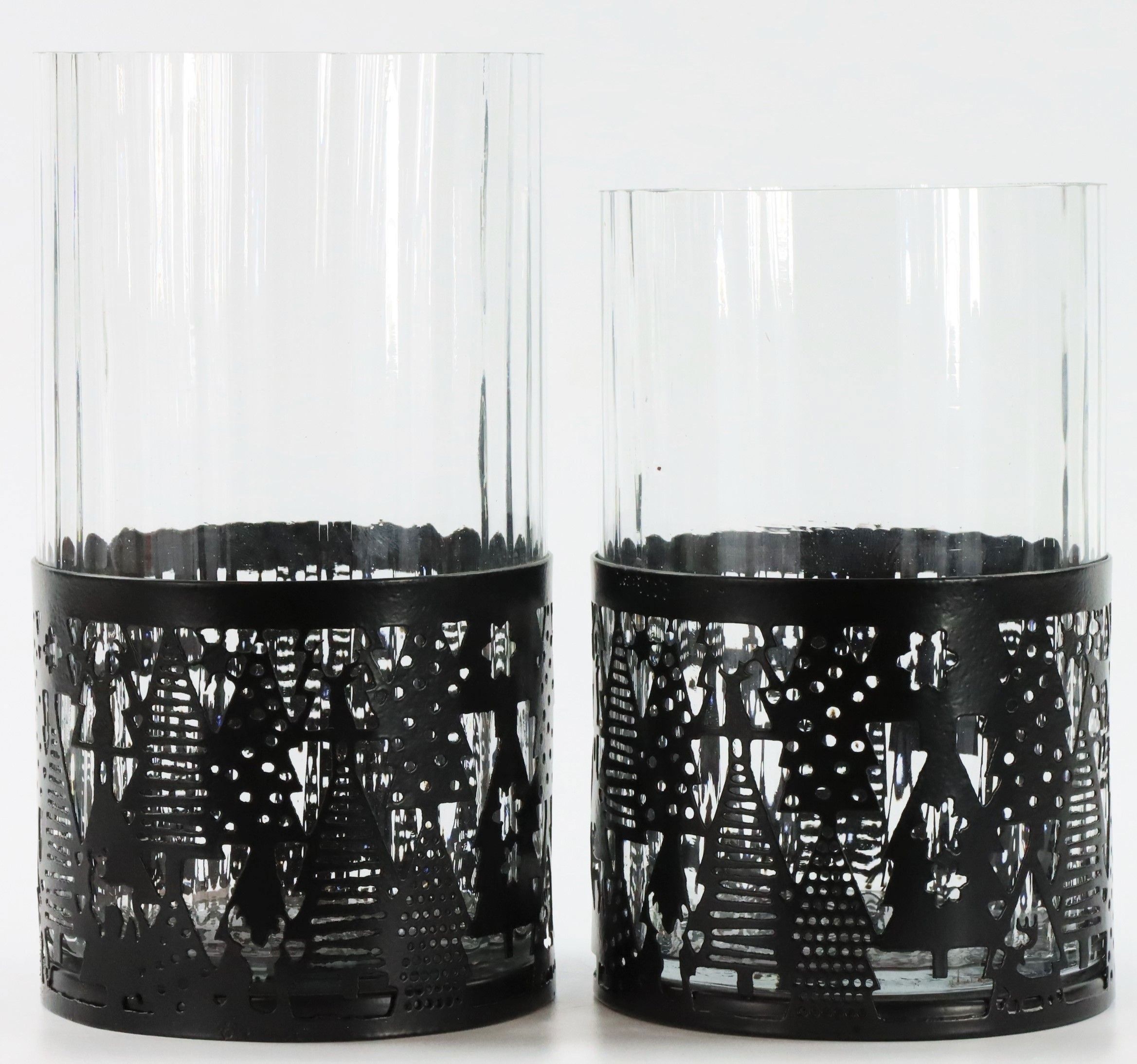 Die Windlichter im Set bestehen aus hochwertigem Glas und einem äußeren Mantel aus robustem Metall, das mit einem dekorativen, schwarzen Waldmotiv verziert ist. Dieses Design kombiniert nicht nur Wärme und Gemütlichkeit, sondern sorgt zugleich für eine stilvolle und moderne Optik. Mit einer Höhe von ca. 15 cm und 18 cm passen sie sich mühelos verschiedenen Dekorationen an und sind vielseitig einsetzbar.