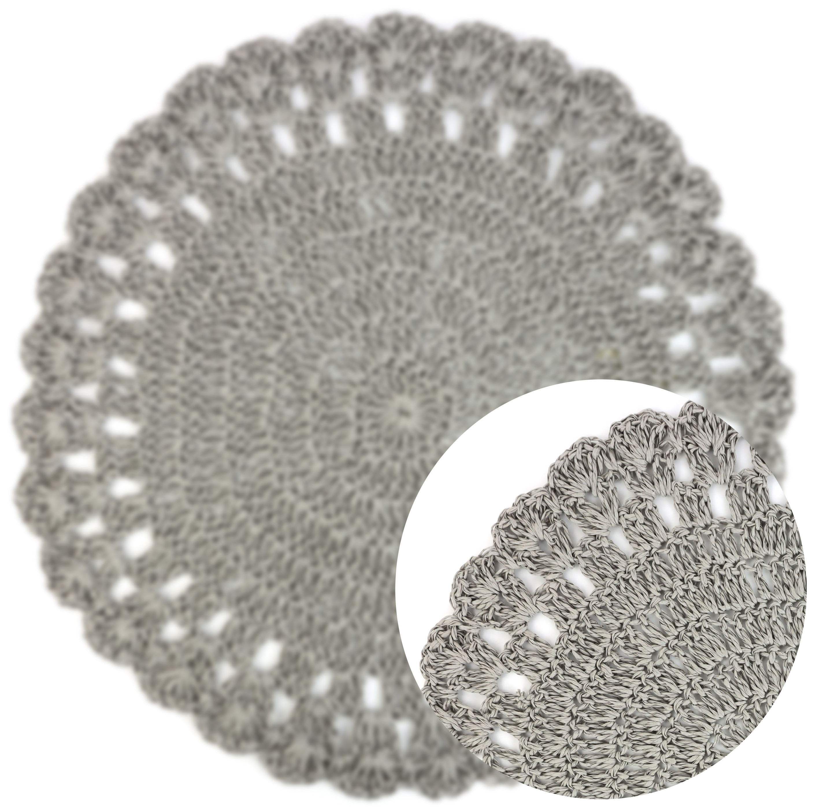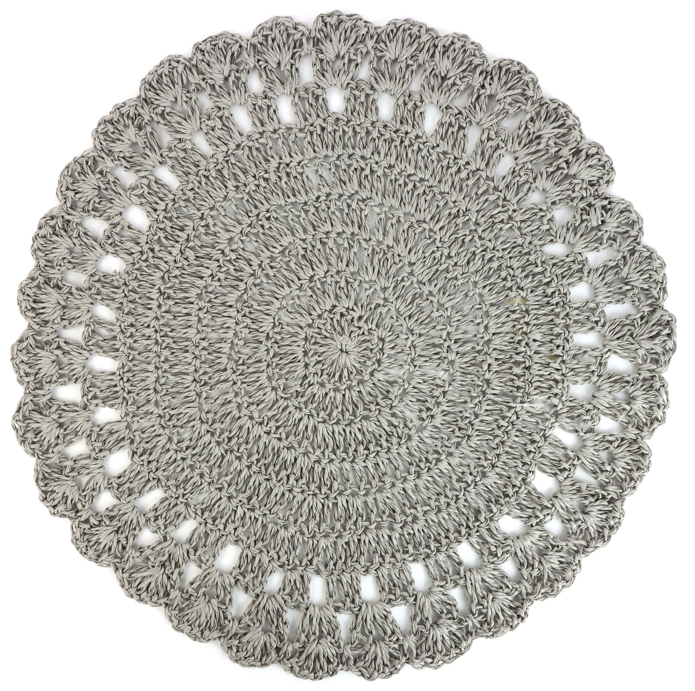 Gefertigt aus hochwertiger Raffia, beeindruckt das Tischset durch seine natürliche Textur und die gehäkelte Struktur, die jedem Raum eine warme und einladende Atmosphäre verleiht. Mit einem Durchmesser von 38 cm bietet es ausreichend Platz für das geschmackvolle Arrangieren von Geschirr und Besteck, ohne dabei Ihre Tischfläche zu überladen. Die dezente graue Farbe fügt sich nahtlos in jede Einrichtung ein und lässt sich mühelos mit verschiedensten Farbschemata kombinieren, ohne die Harmonie des Gesamtdesigns zu stören.