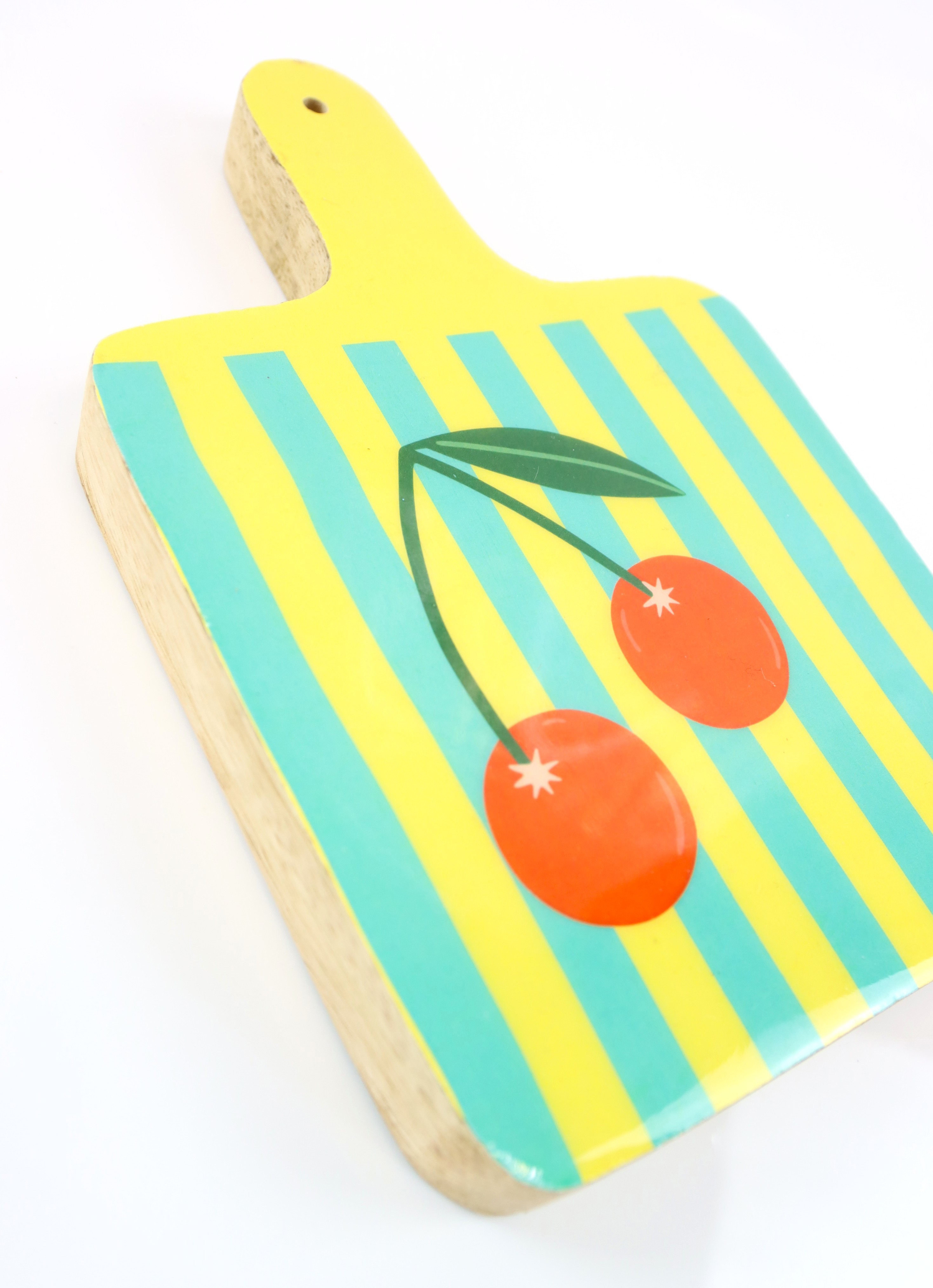 Das Brett ist in einem lebendigen, gestreiften Design in Gelb und Blau gehalten, das nicht nur die Augen Ihrer Kunden anspricht, sondern auch als dekorativer Blickfang dient. Die Verwendung von Mangoholz bietet nicht nur eine edle Anmutung, sondern auch eine umweltfreundliche Wahl, da Mangoholz ein nachhaltiges Material ist. Zudem ist das Email, das die Oberfläche ziert, beständig gegen Verschleiß und schützt das Holz vor Feuchtigkeit.