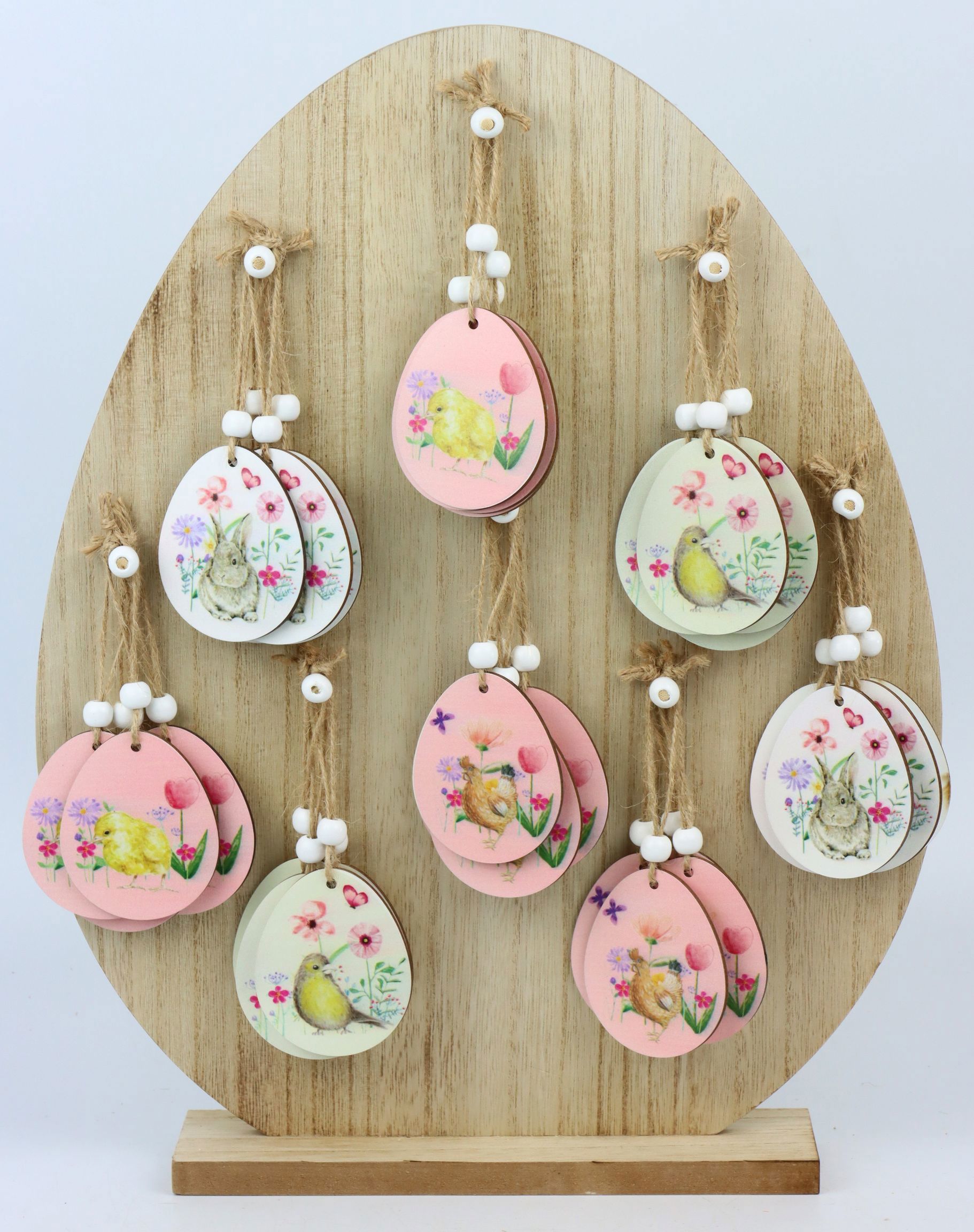 Das Eierdisplay "Vintage Easter" hat eine beeindruckende Höhe von ca. 40 cm und kombiniert klassische Ostertraditionen mit einem Hauch von nostalgischem Charme. Jedes der 33 Hängeeier hat eine Größe von ca. 7 cm und ist mit liebevollen vintage-inspirierten Mustern verziert. Diese edle Gestaltung zieht die Blicke Ihrer Kunden auf sich und verleiht Ihren Verkaufsflächen eine einladende und warme Atmosphäre.