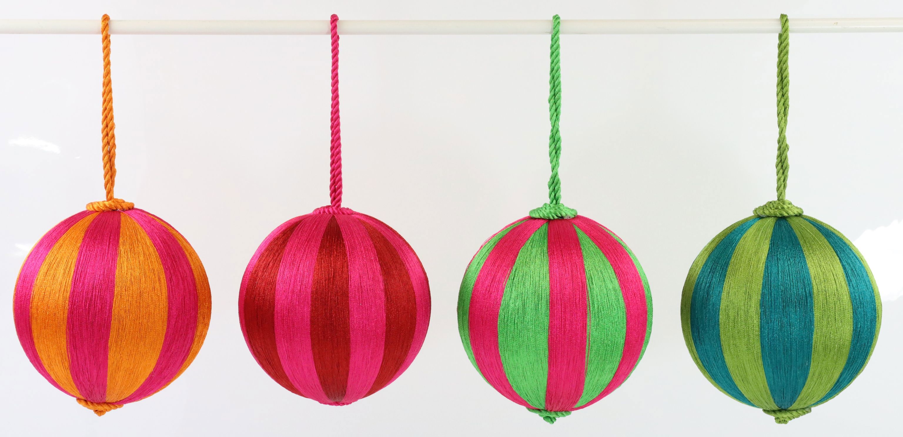 Die Kugeln zeichnen sich durch ihre einzigartigen, farbenfrohen Streifen aus, die durch die edle Textur der Seide besonders gut zur Geltung kommen. Jeder Streifen ist sorgfältig aufgebracht, um ein harmonisches und zugleich lebhaftes Gesamtbild zu erzeugen. Die Kombination aus hochwertigen Materialien sorgt nicht nur für ein optisches Highlight, sondern garantiert auch eine hohe Strapazierfähigkeit. Dies macht diese Weihnachtskugeln zu einer ausgezeichneten Investition für Sie und Ihre Kunden.