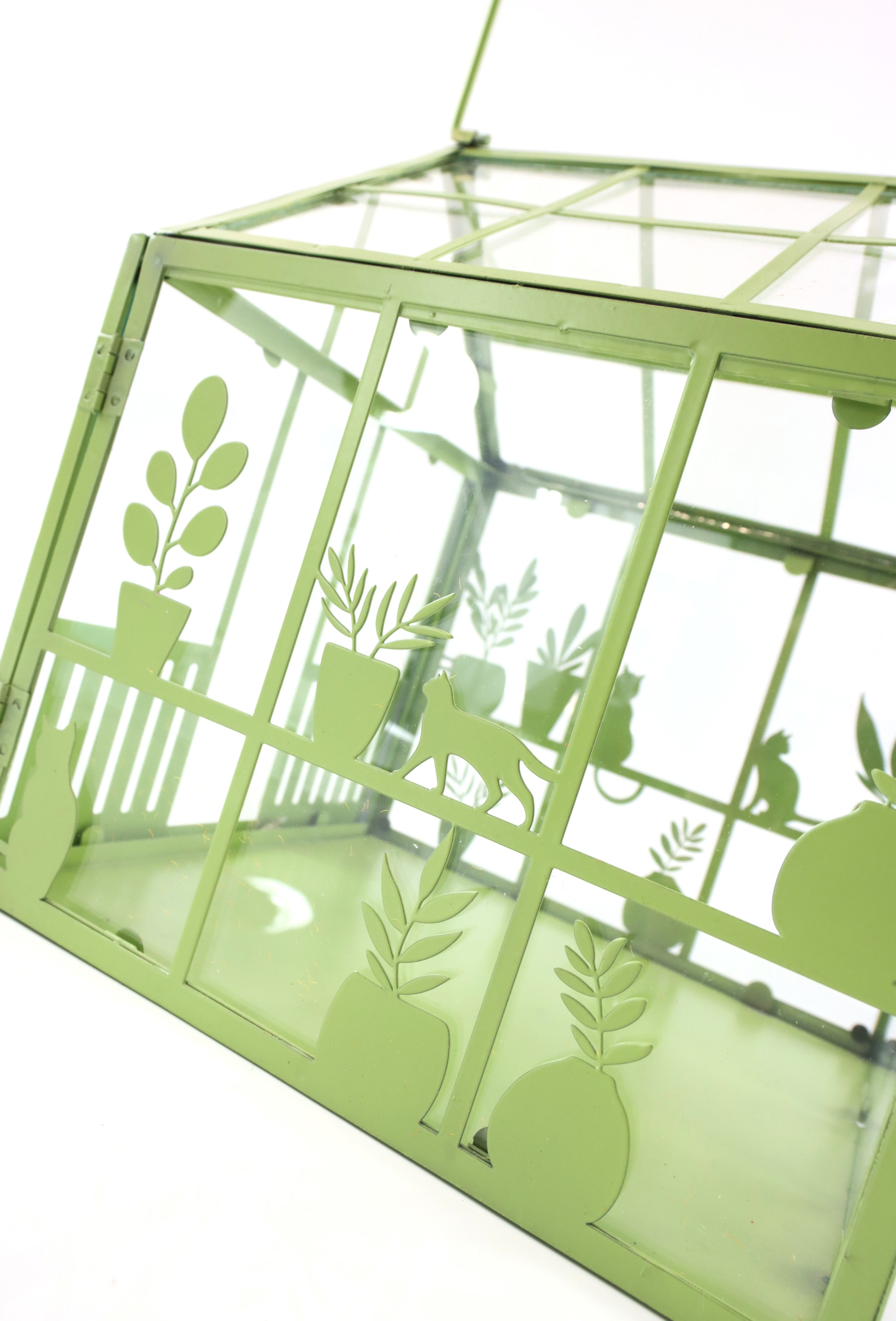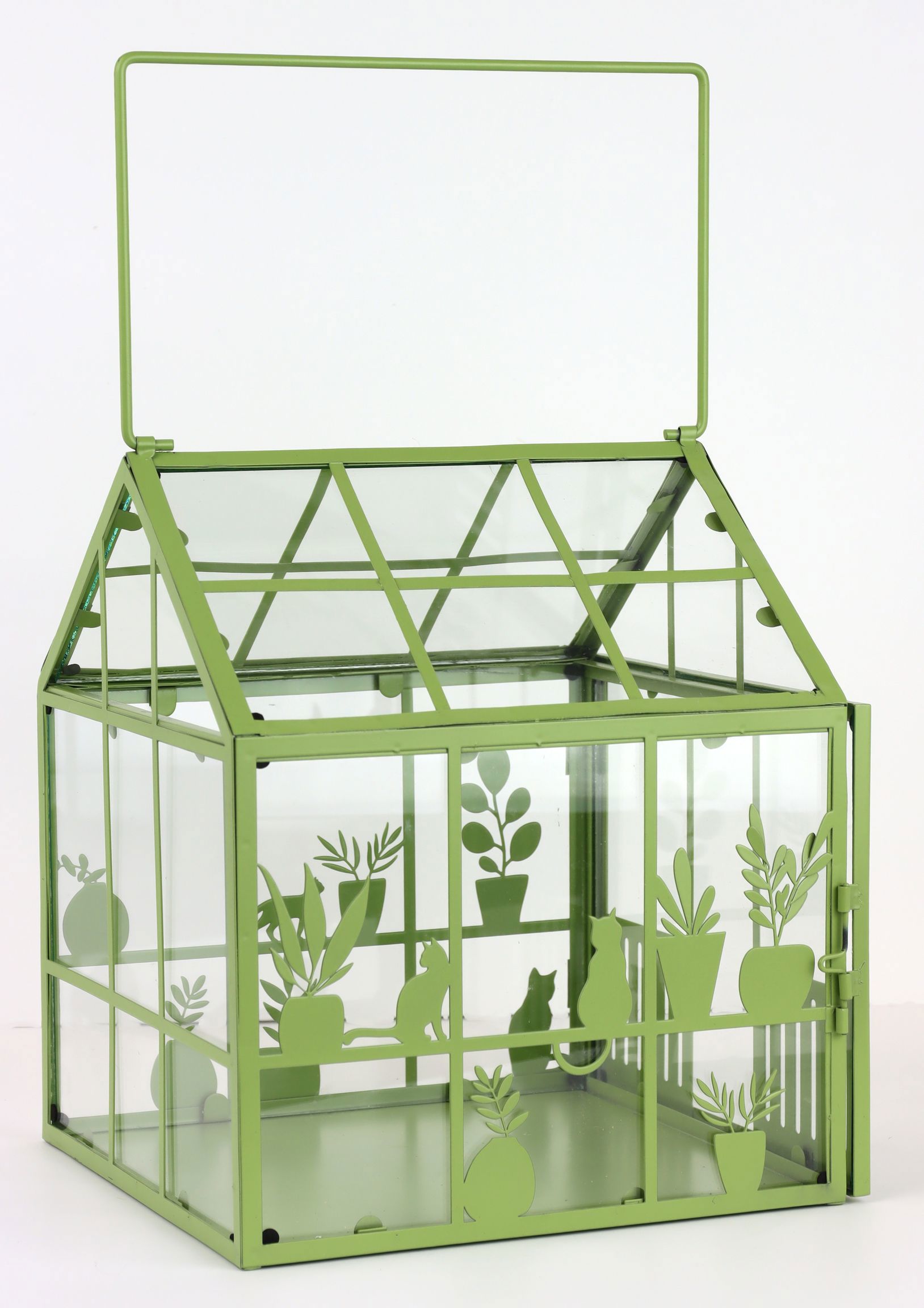 Gefertigt aus robustem Eisen und klarem, langlebigem Glas ist das GREENHOUSE "LEAVE&LUMEN" nicht nur ein attraktiver Blickfang, sondern auch äußerst funktional. Mit einer Höhe von ca. 23 cm eignet es sich ideal für die stilvolle Präsentation von Pflanzenarrangements oder dekorativen Akzenten in Verkaufsräumen. Das frische Grün des Eisengestells harmoniert perfekt mit den transparenten Glaselementen und unterstreicht die natürliche Schönheit Ihrer Produkte.