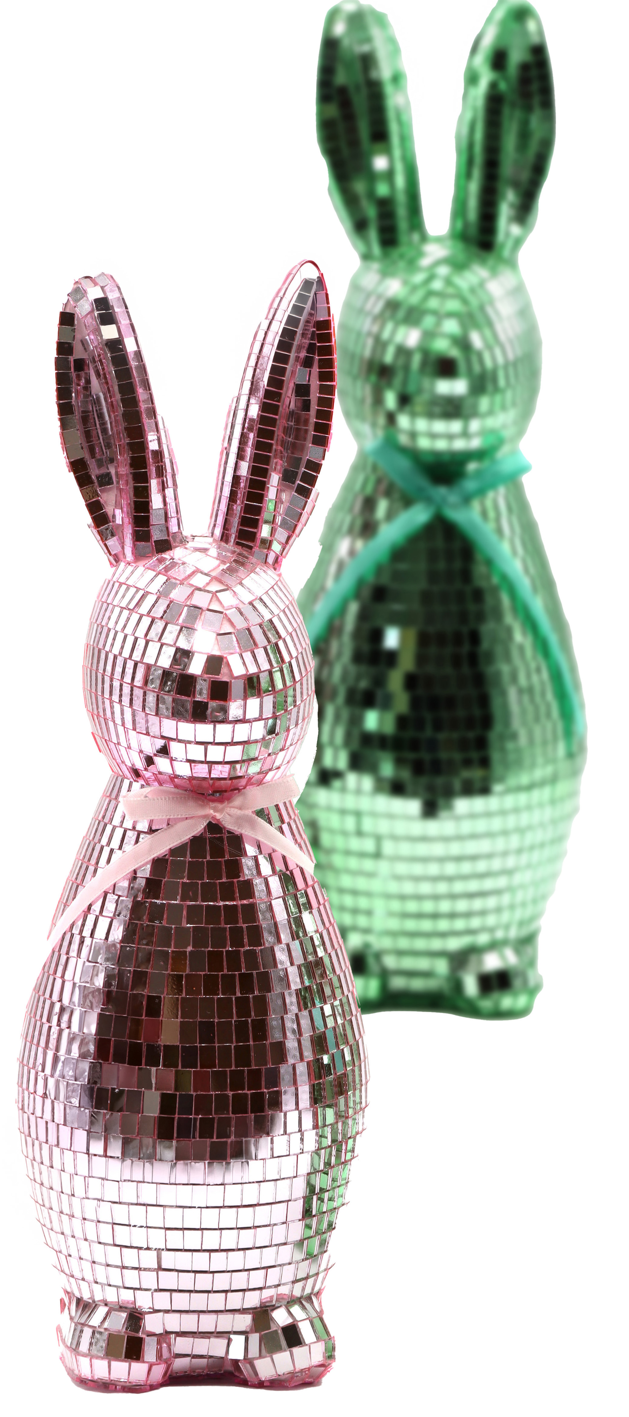 Verleihen Sie Ihrem Geschäft ein zauberhaftes Osterflair mit unserem einzigartigen Hasen-Set "Easter Glam". Speziell für den stationären Einzelhandel im Bereich Wohnen und Lifestyle designt, bietet dieses dekorative Set eine herausstechende, glamouröse Ästhetik, die Ihre Kunden begeistern wird. Jeder der beiden Hasen ist in einem modernen, glänzenden Spiegel-Look gehalten, der sowohl das Licht optimal reflektiert als auch farblich besonders durch das zarte Rosa und das frische Grün auffällt. Mit einer Höhe von ca. 30 cm sind die Hasen ein ideales Highlight für jede Dekoration.