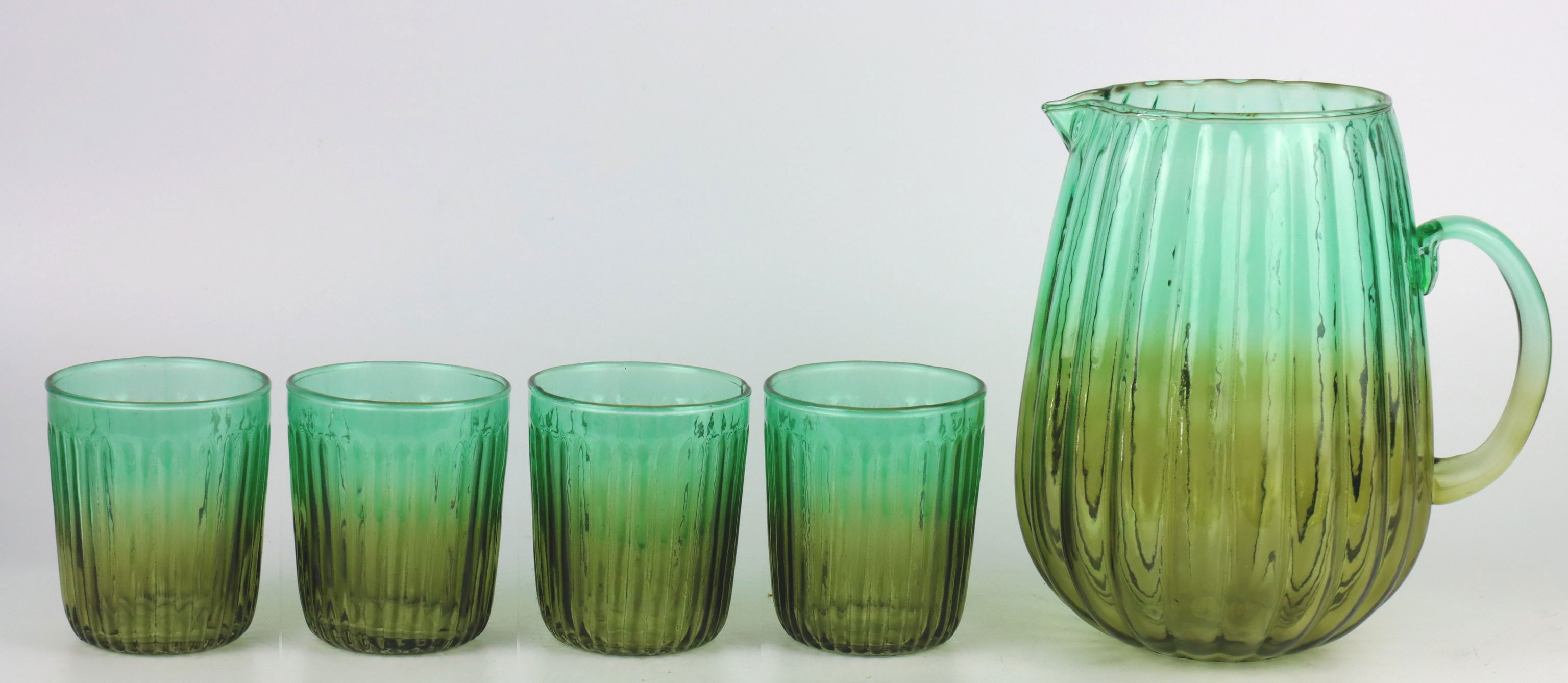 Mit dem Karaffenset "Green Harmony" können Ihre Kunden stilvoll Getränke servieren - ob erfrischendes Wasser, frisch gepresste Säfte oder edle Weine. Die Karaffe hat ein großzügiges Fassungsvermögen, während die Gläser handlich und doch großzügig genug sind, um jedem Getränk den nötigen Raum zu geben. Dies macht das Set ideal für den Einsatz zu Hause, bei Dinnerpartys oder für besondere Anlässe, die ein elegantes Ambiente erfordern.