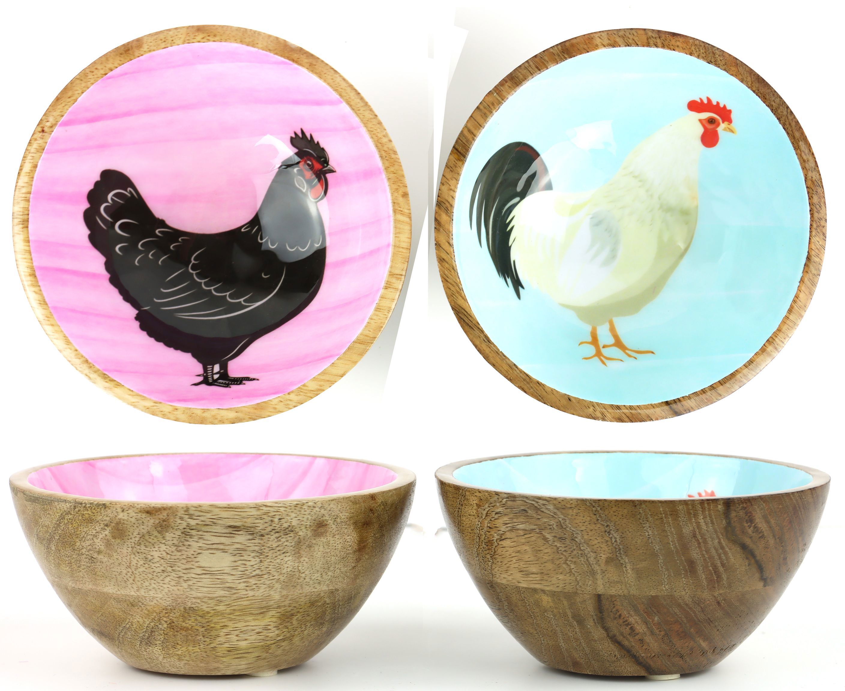 Entdecken Sie das charmante Schalenset "KIKERIKI", das aus zwei kunstvoll gefertigten Holzschalen besteht und speziell für die Osterzeit konzipiert wurde. Dieses Set bringt mit seinem verspielten Huhn- und Hahn-Design frischen Wind in jedes Wohnambiente und ist das perfekte Accessoire für den stationären Einzelhandel im Bereich Wohnen und Lifestyle. Die Schalen sind nicht nur ein dekorativer Hingucker, sondern bieten mit ihren ca. 15 cm Durchmesser auch noch praktische Nutzungsmöglichkeiten.