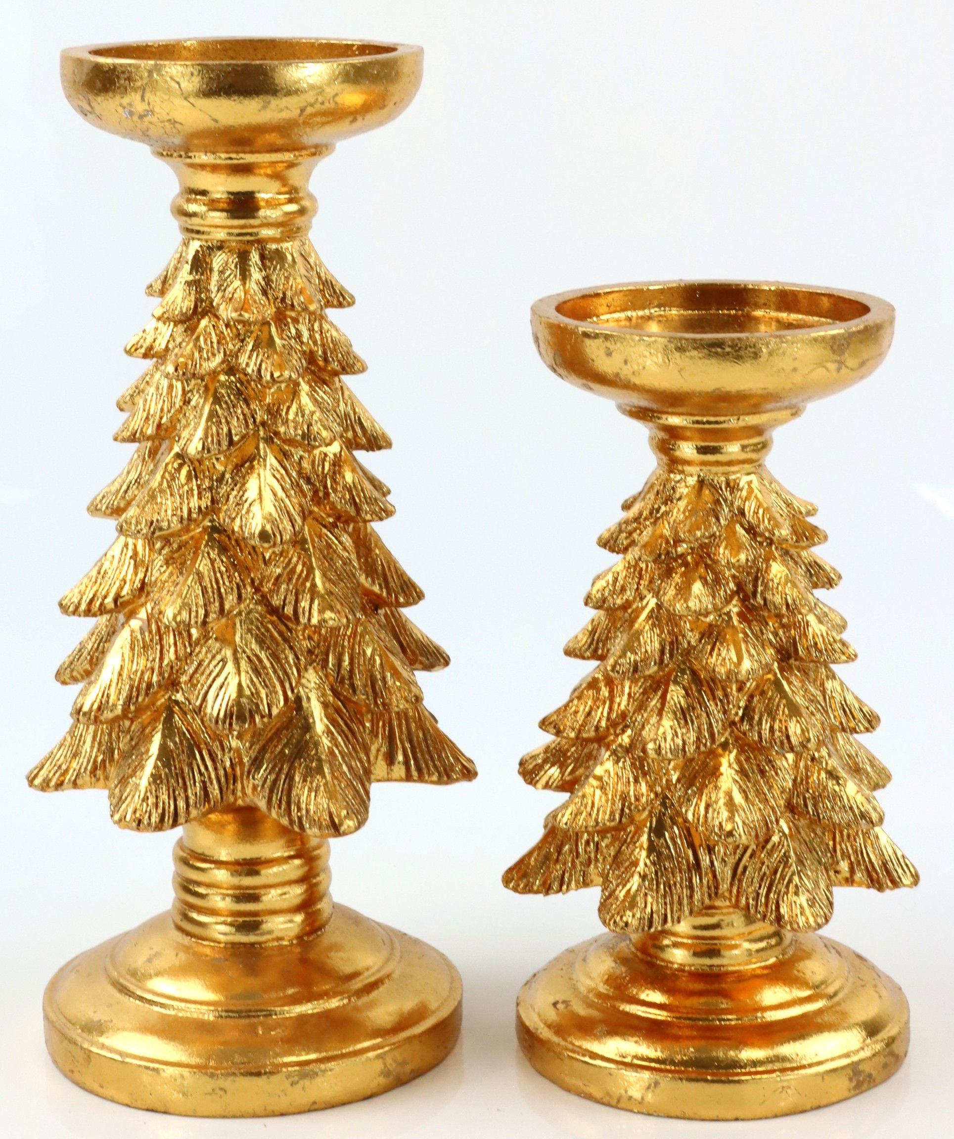 Verleihen Sie Ihrem Wohnraum oder Ihrem Geschäft eine festliche und stilvolle Atmosphäre mit unserem exquisiten Kerzenhalter-Set "MAJESTIC TREE". Dieses besondere Set besteht aus zwei unterschiedlich großen Weihnachtsbaum-Kerzenhaltern, die sich perfekt in jede Weihnachtsdekoration integrieren lassen. Das elegante 2-teilige Set umfasst Kerzenhalter in den Höhen von ca. 26 cm und 19 cm und ist aus hochwertigem Polyresin gefertigt. Dank des luxuriösen Goldtons versprühen die Kerzenhalter einen Hauch von Eleganz und Glanz, der jede Weihnachtsdekoration aufwertet.