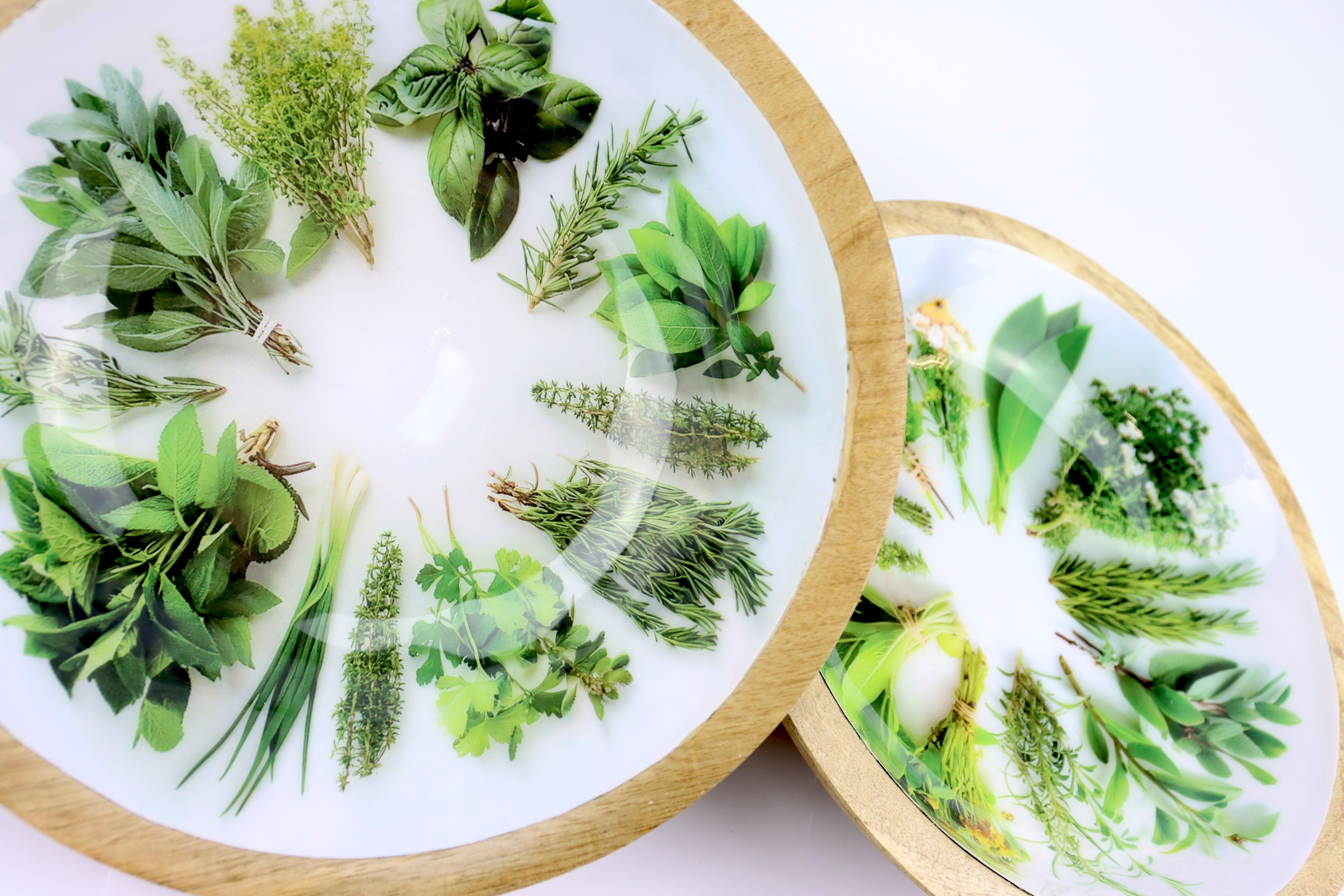 Das spezielle Design mit dem Kräuterdruck verleiht den Holzschalen eine frische und natürliche Ausstrahlung, die besonders gut in eine Umgebung mit natürlichen oder organischen Akzenten passt. Diese Schalen sind ein idealer Zusatz für Geschäfte, die ihren Kunden nachhaltige und stilvolle Dekorationslösungen anbieten möchten.