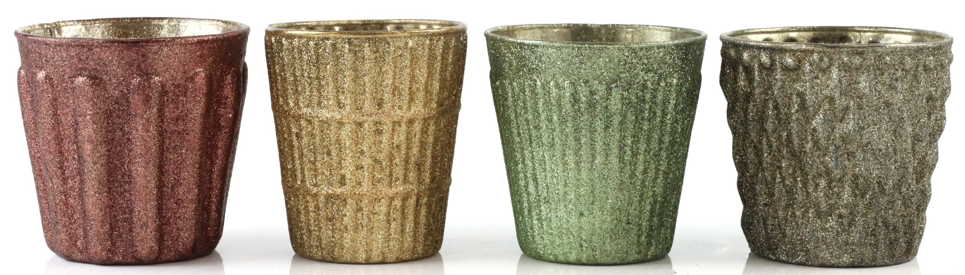 - Elegantes Vierer-Set aus Glas mit Glitzer in warmen Herbst- und Winterfarben.