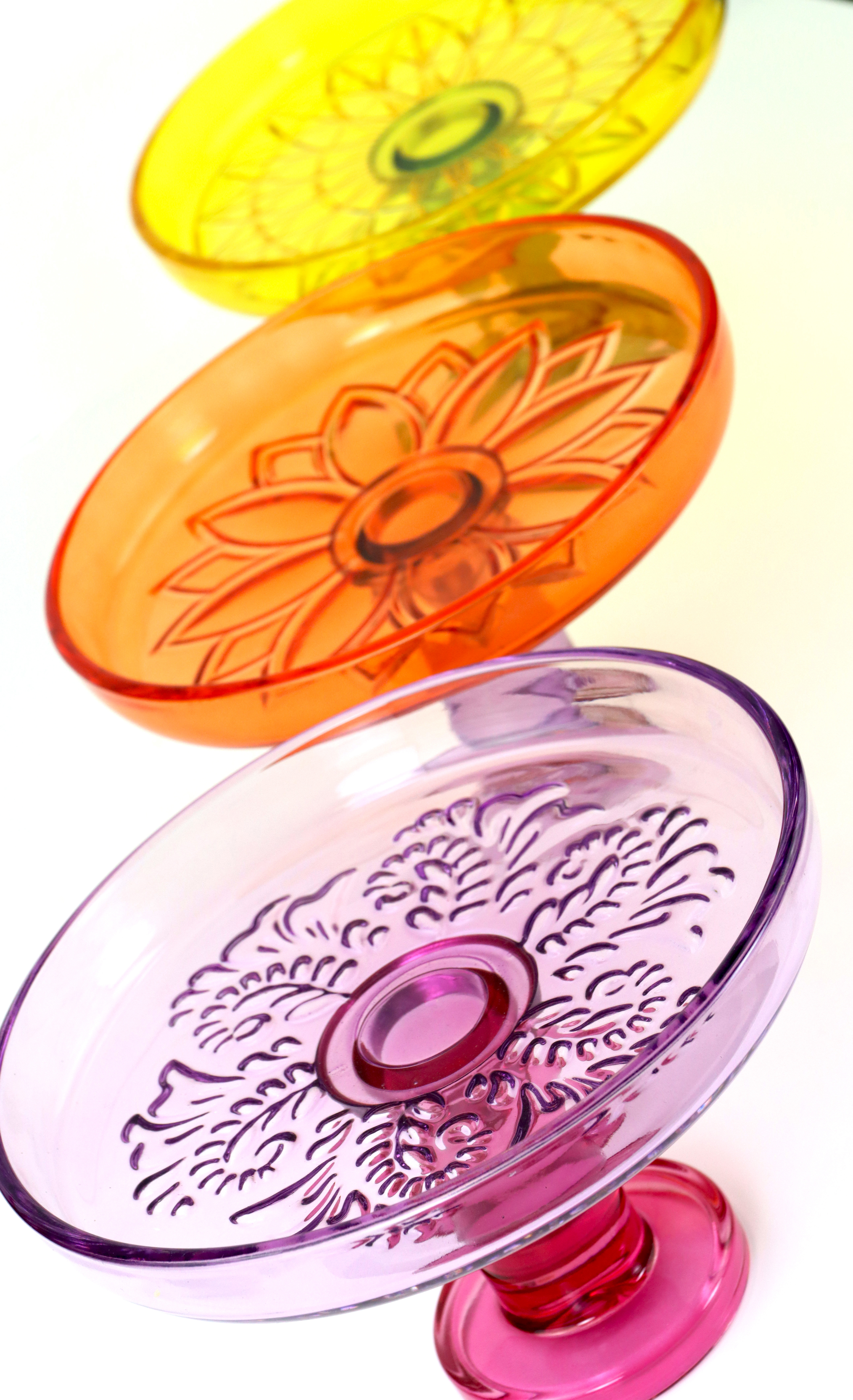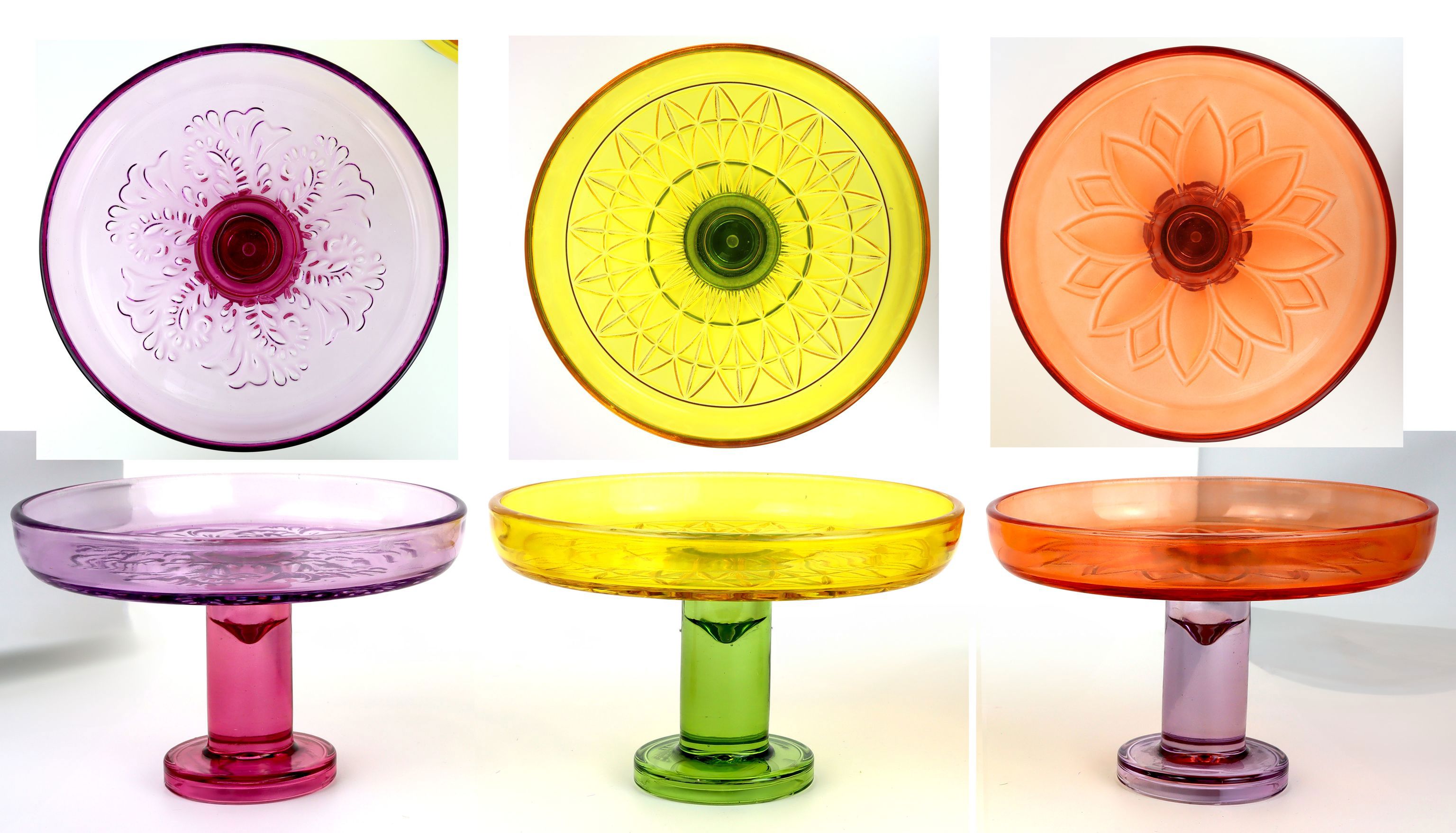 - **Einzigartiges Design:** Drei farbenfrohe Glaspokale in Lila, Gelb und Orange.
