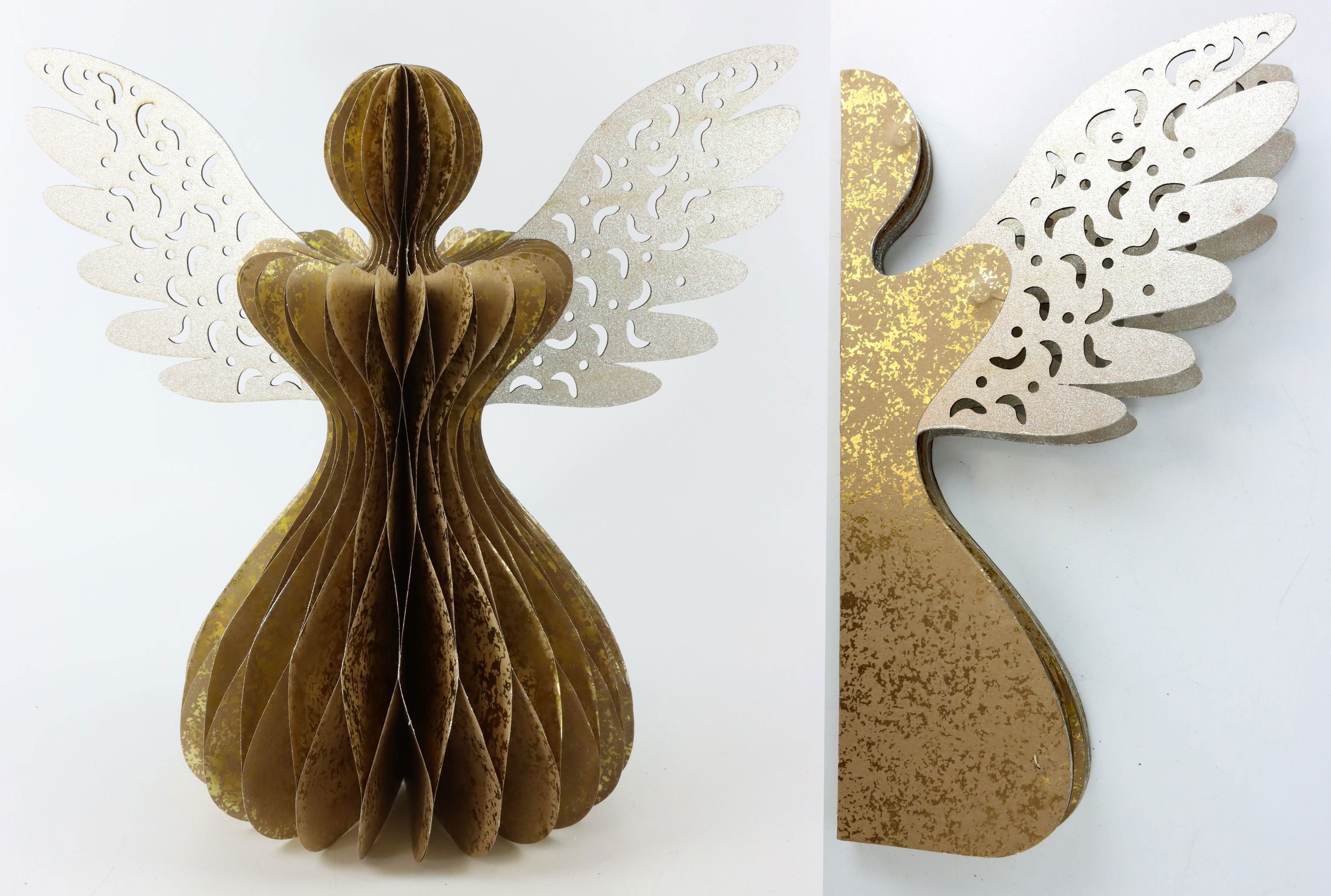 - Beschaffenheit: Faltbarer Dekoengel in Gold mit silbernen Flügeln aus Papier