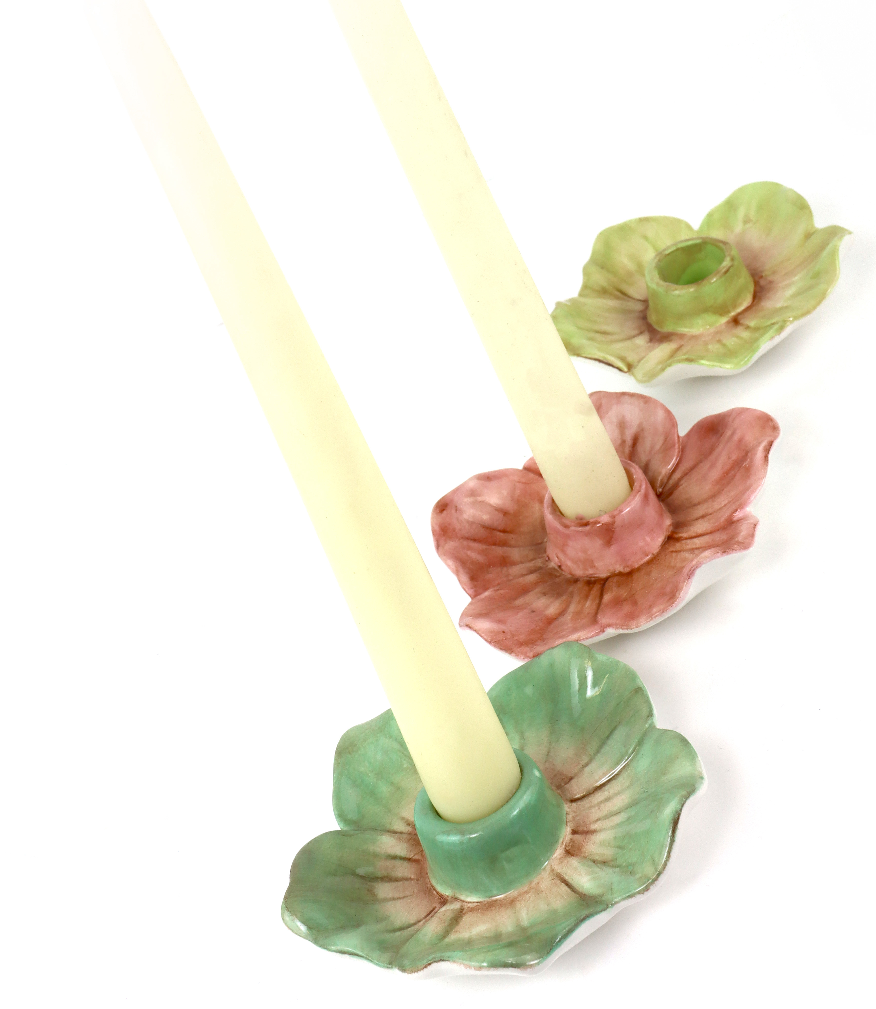 - Set bestehend aus drei Kerzenhaltern in frischen Farben: Grün, Rosa und Gelb.