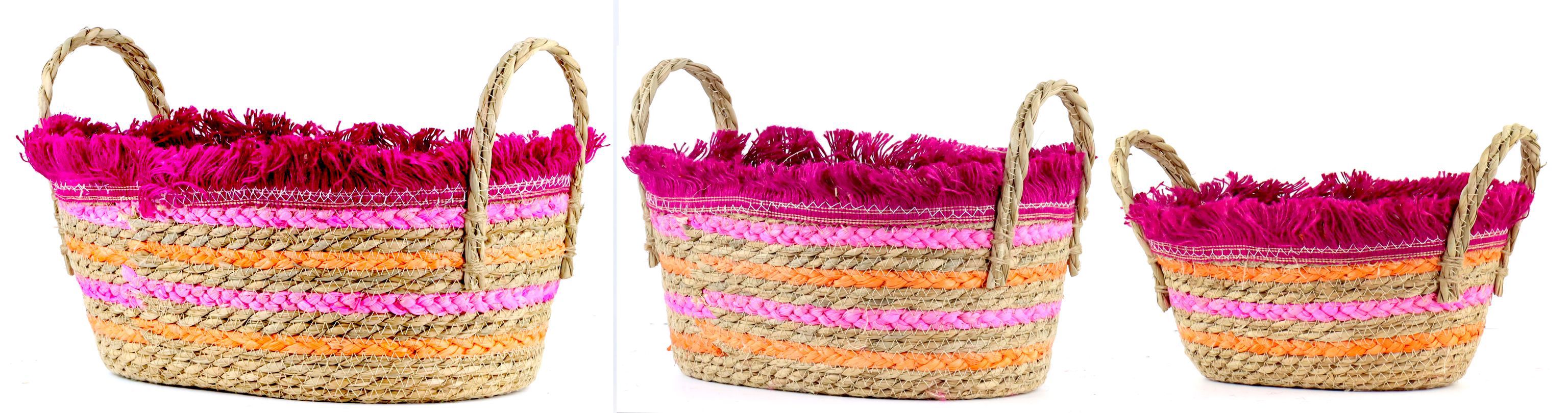 Entdecken Sie unser exklusives Set aus ovalen Körben, die "Zahara Stripes". Diese handgefertigten Körbe sind perfekte Begleiter für den stilbewussten stationären Einzelhandel im Bereich Wohnen und Lifestyle. Mit ihrer natürlichen Optik und vielseitigen Einsatzmöglichkeiten überzeugen die Ovalkörbe in jedem Einrichtungskonzept. Durch die Verwendung von hochwertigem Seegras als Material fügen sie sich nahtlos in verschiedene Interior-Stile ein, von Boho Chic über skandinavisches Design bis hin zu rustikalen Ansätzen. Mit den Maßen von 38 cm, 32 cm und 27 cm bieten sie nicht nur reichlich Stauraum, sondern sind auch ein echtes Highlight in jeder Ladenauslage.