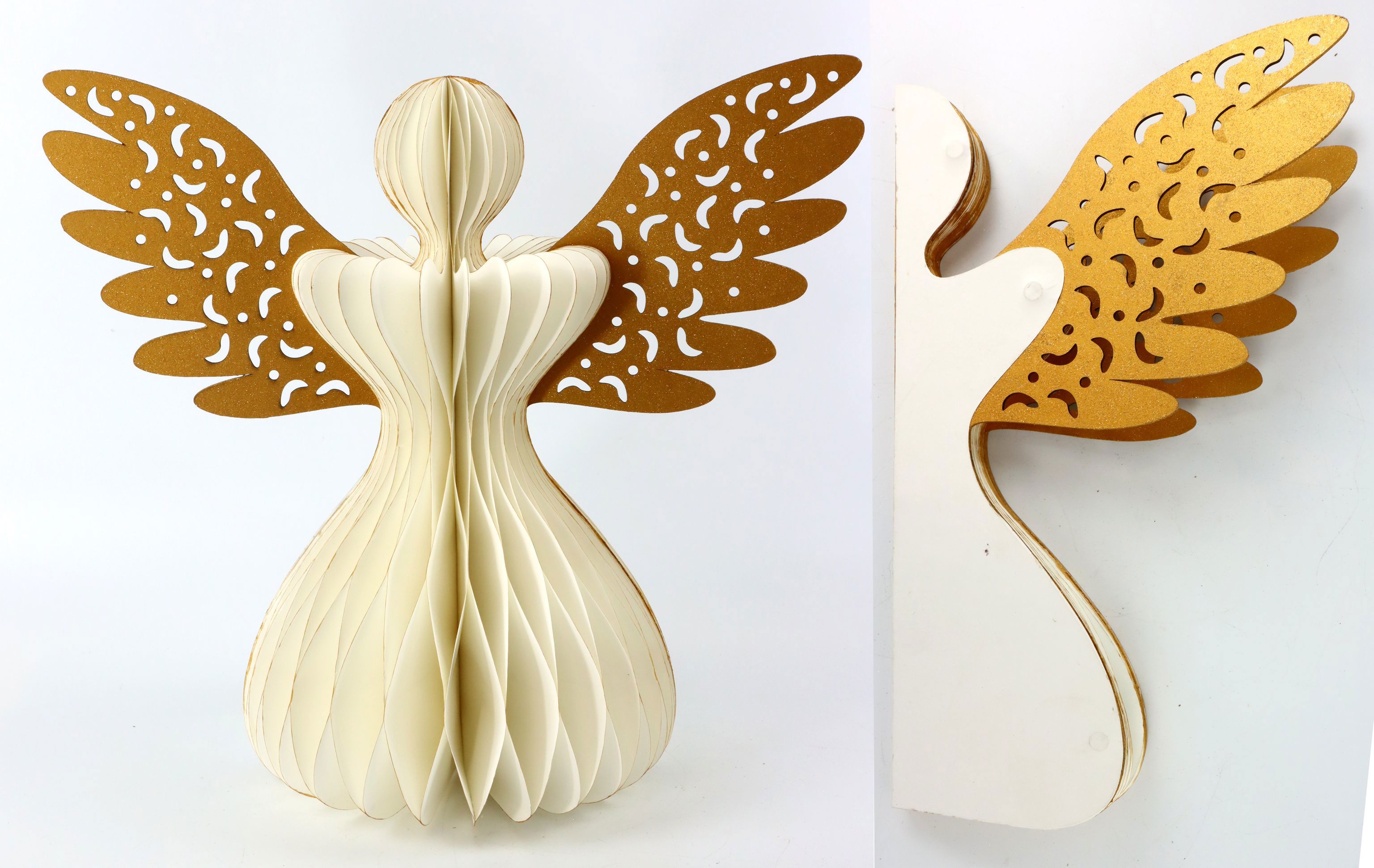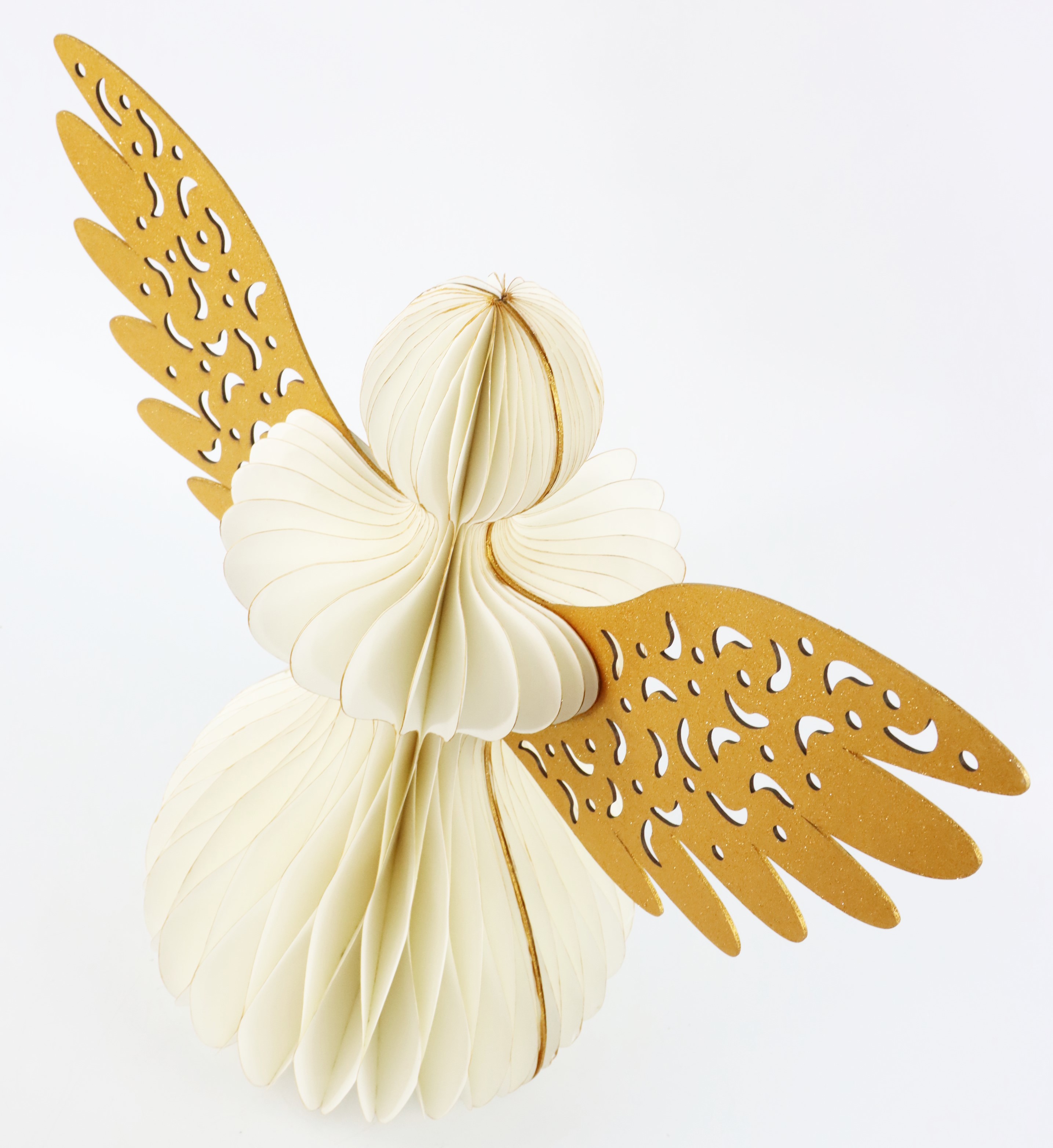 Unser Dekoengel "Honeycomb" ist aus speziell ausgewähltem, robusten Papier gefertigt und misst etwa 45 cm. Dieser Engel in elegantem Weiß mit goldenen Flügeln ist ein Hingucker und verleiht jedem Raum, in dem er platziert wird, einen Hauch von festlicher Sanftheit und Wärme. Mit seiner Faltfähigkeit ist der Engel einfach aufzustellen, zu lagern und zu transportieren, was ihn zu einer idealen Wahl für Einzelhändler macht.
