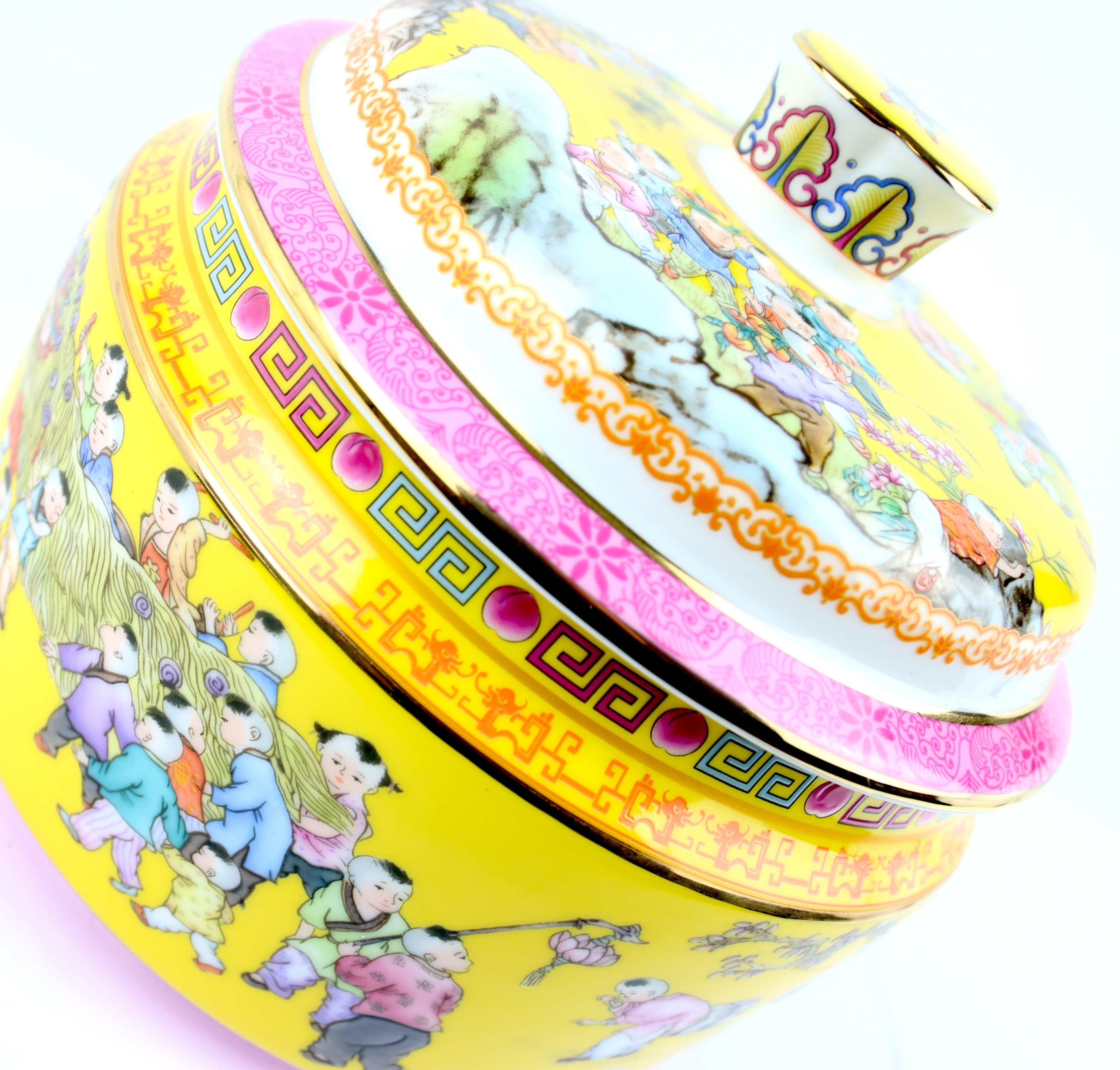 Entdecken Sie die faszinierende Welt des asiatischen Designs mit unserer exklusiven Objektdose "CHINESE CHILDREN". Handgefertigt aus hochwertigem Porzellan, vereint dieses dekorative Kunstwerk traditionelle Handwerkskunst mit modernem Flair. Die Objektdose präsentiert sich mit einem eleganten gelben Blumenmuster, das sofort das Interesse Ihrer Kunden wecken wird. Mit einer Höhe von etwa 17 cm ist sie das ideale Accessoire, um jedem Raum einen Hauch von Exotik und Eleganz zu verleihen.