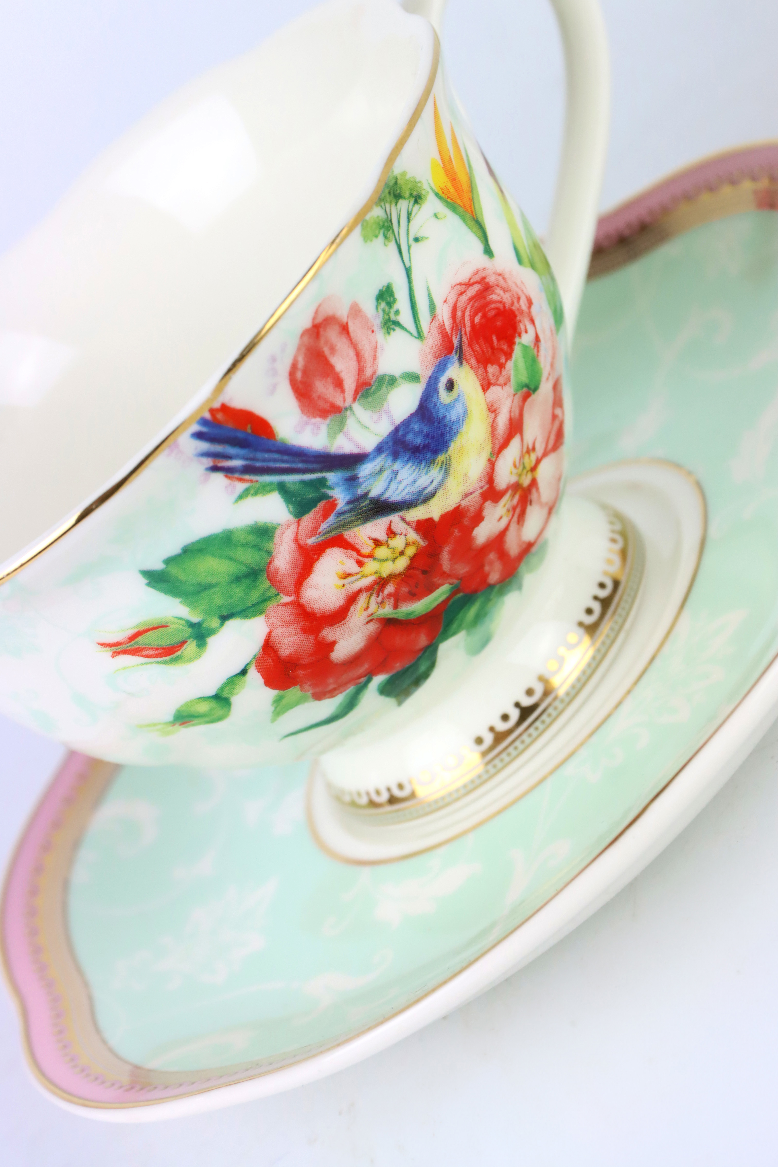 The central element of any sophisticated coffee table is the motif of a charming bird, which is skilfully placed on the fine porcelain (New Bone China). This material is known for its particular durability and elegant appearance, which your customers will undoubtedly appreciate. New Bone China is successful in combining robustness and aesthetic pleasure, making it perfect for the high-end home and lifestyle retail sector.