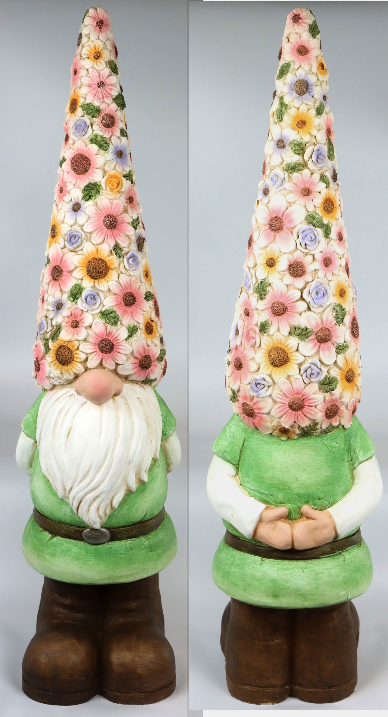 Experience the magic of spring and summer with our enchanting flower gnome - a unique decorative piece that will create a spring-like atmosphere in any garden or living area. With an impressive size of approx. 97 cm, this cute clay fibre figure is guaranteed to catch everyone's eye and is an indispensable highlight in your seasonal decorations.