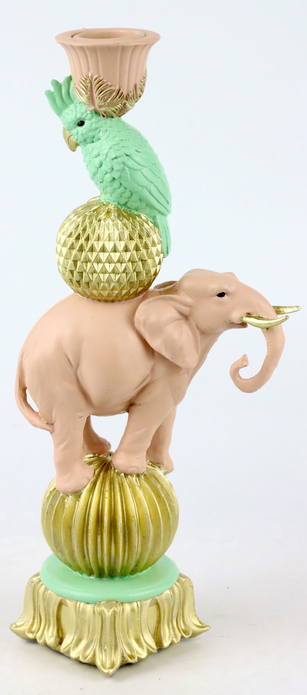 The combination of ceramic and polyresin allows you to create a detailed elephant design, while metal accents give the candlestick a modern yet timeless character. This will appeal to lovers of both traditional and modern decoration. Rely on the "EXOTIC ELEPHANT" chandelier for an unrivalled product presentation that will make both your customers' hearts and your sales figures beat faster.