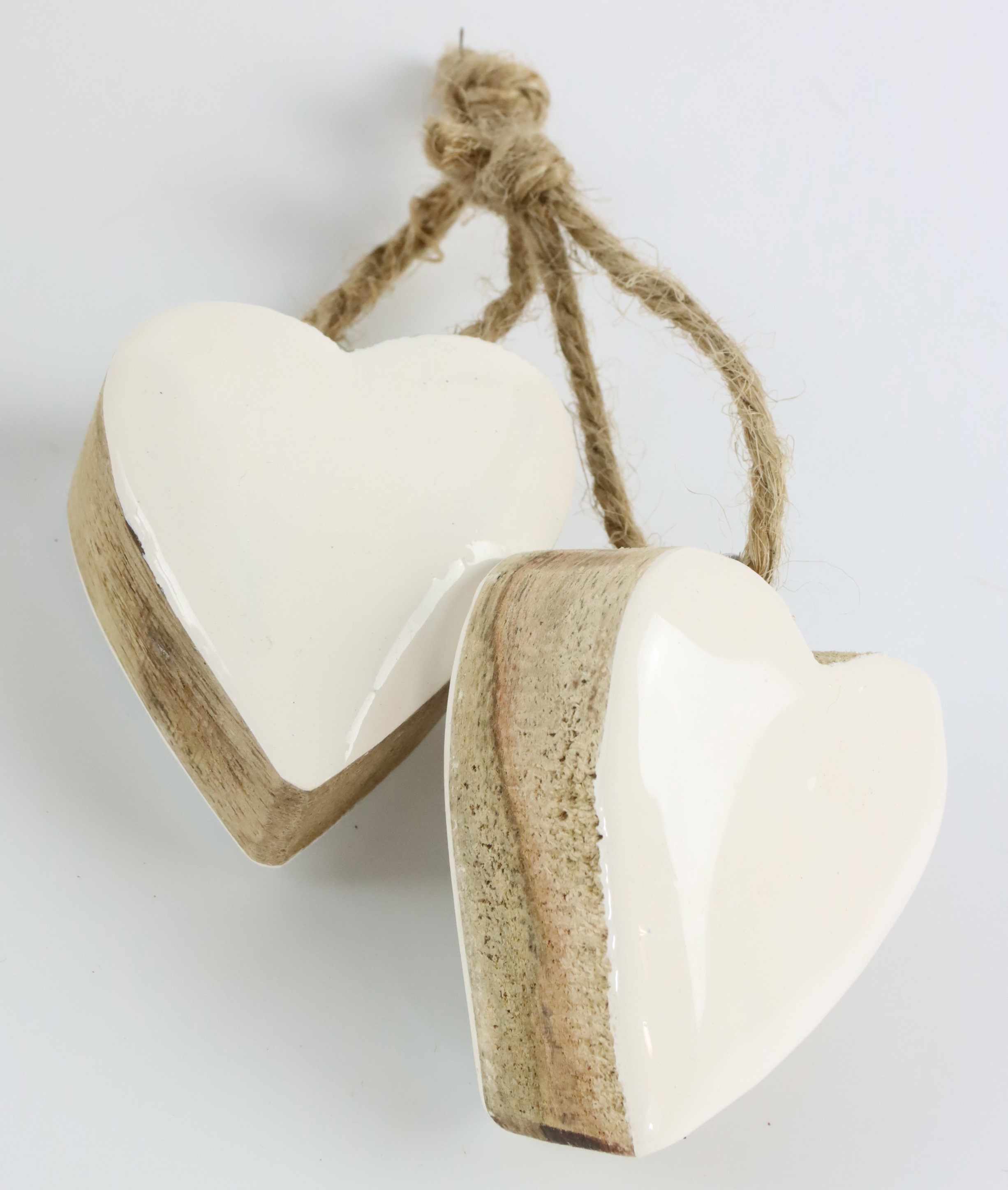 The combination of fine glass and sustainable mango wood gives the set a special quality and appeals to customers who love sustainable yet stylish decorations. The white colour scheme of the heart pendants looks fresh, clear and stands the test of time.
