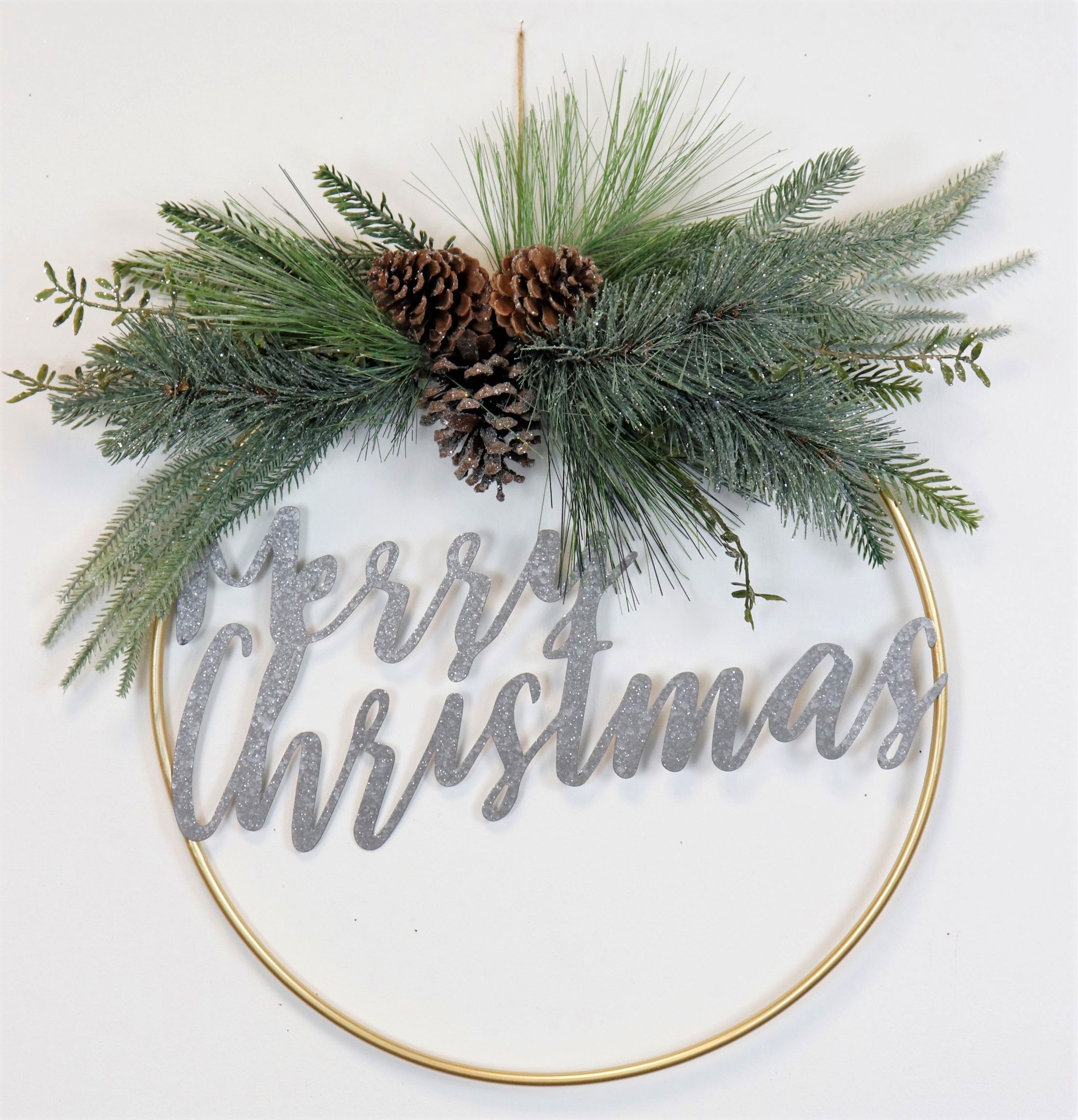 The "MERRY CHRISTMAS" decorative wreath impresses with its elegant mix of metal, plastic and real cones. The lettering "MERRY CHRISTMAS" is skilfully integrated into the wreath and gives it its very special charm. The real cones are carefully incorporated into the design and give the wreath a natural touch that sets it apart from other, purely artificial decorations. The use of hard-wearing materials ensures that this festive decoration will last for years to come.