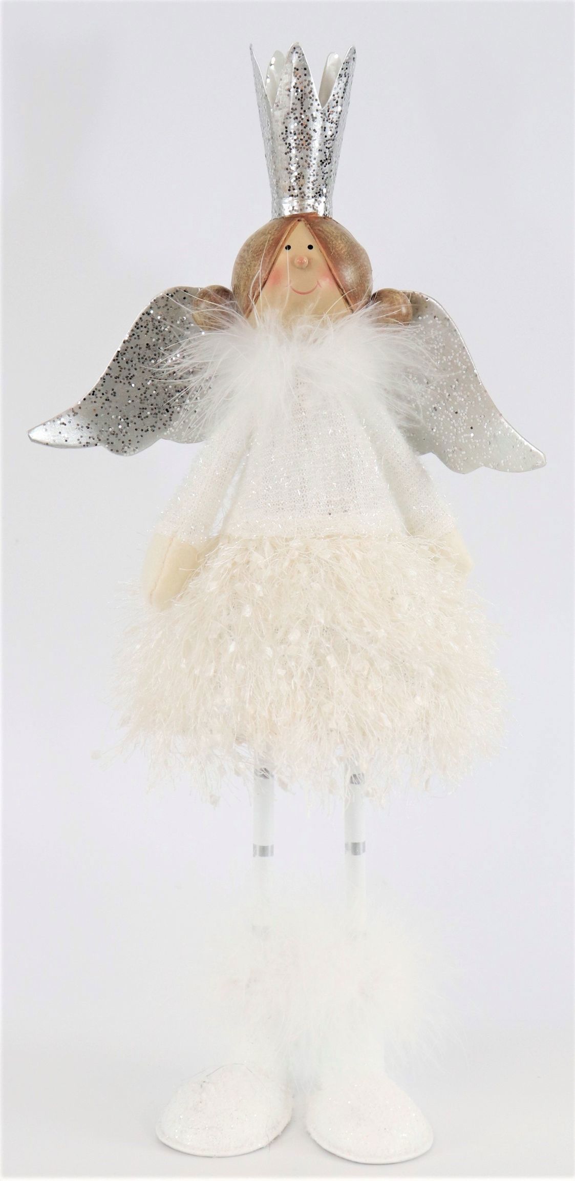 Our "White Beauty" angel is a fascinating decorative element that blends seamlessly into any Christmas ambience. With a height of around 42 cm, it is an imposing yet elegant highlight of any shop window decoration. Made from high-quality materials such as polyresin, polyester and metal, this angel offers long-lasting and robust quality. Polyresin, known for its durability and high-quality appearance, forms the body, while polyester and metal provide delicate accents and a filigree finish.