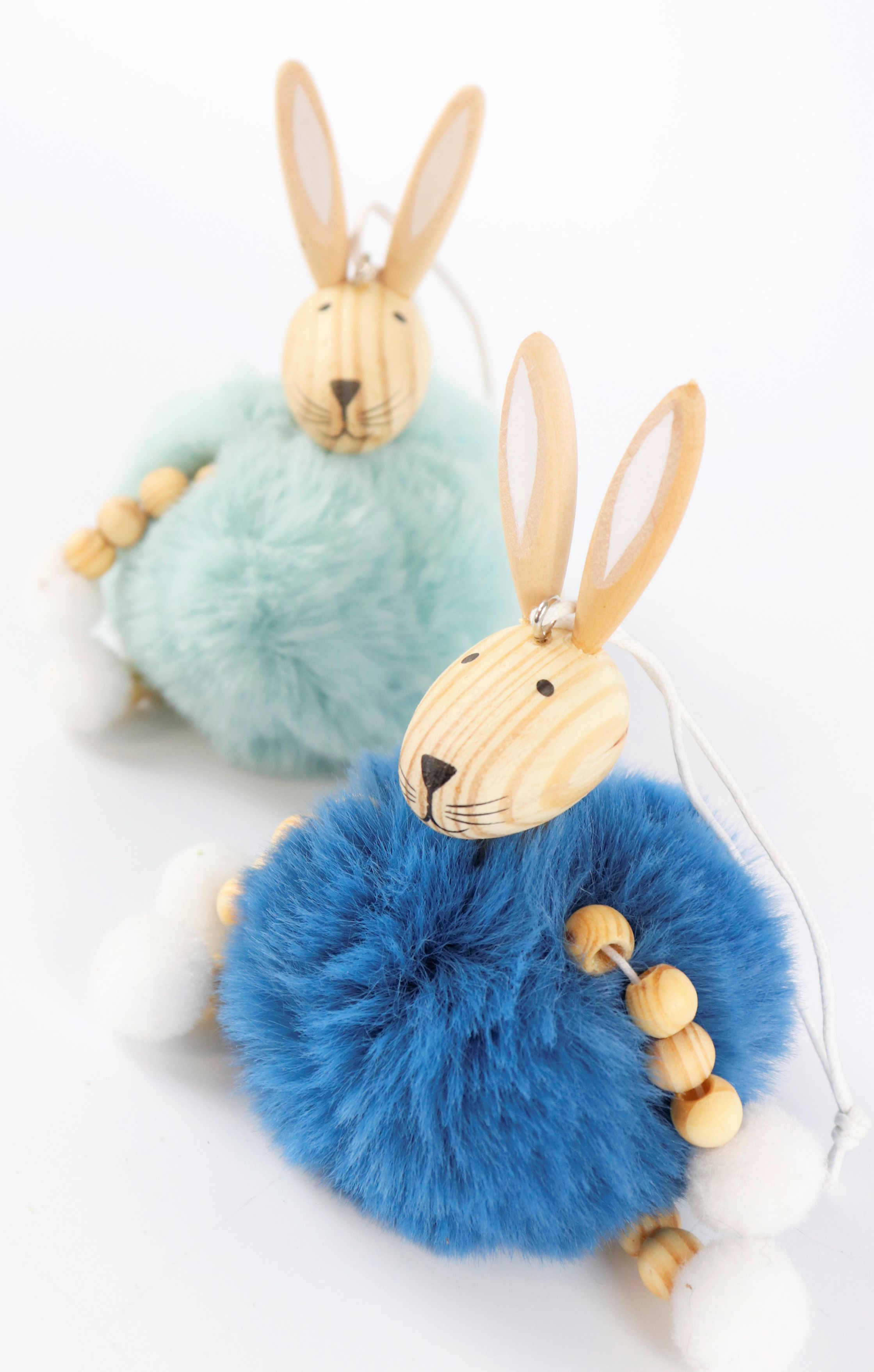 The pompom bunnies come in beautiful shades of blue and blend harmoniously into any Easter decoration. Made from high-quality materials such as polyester, wood and plastic, these bunnies combine durability with an appealing aesthetic. Measuring approx. 18 cm, they are the perfect decoration for tables, shelves or window sills and add a tangible springtime freshness to any room.