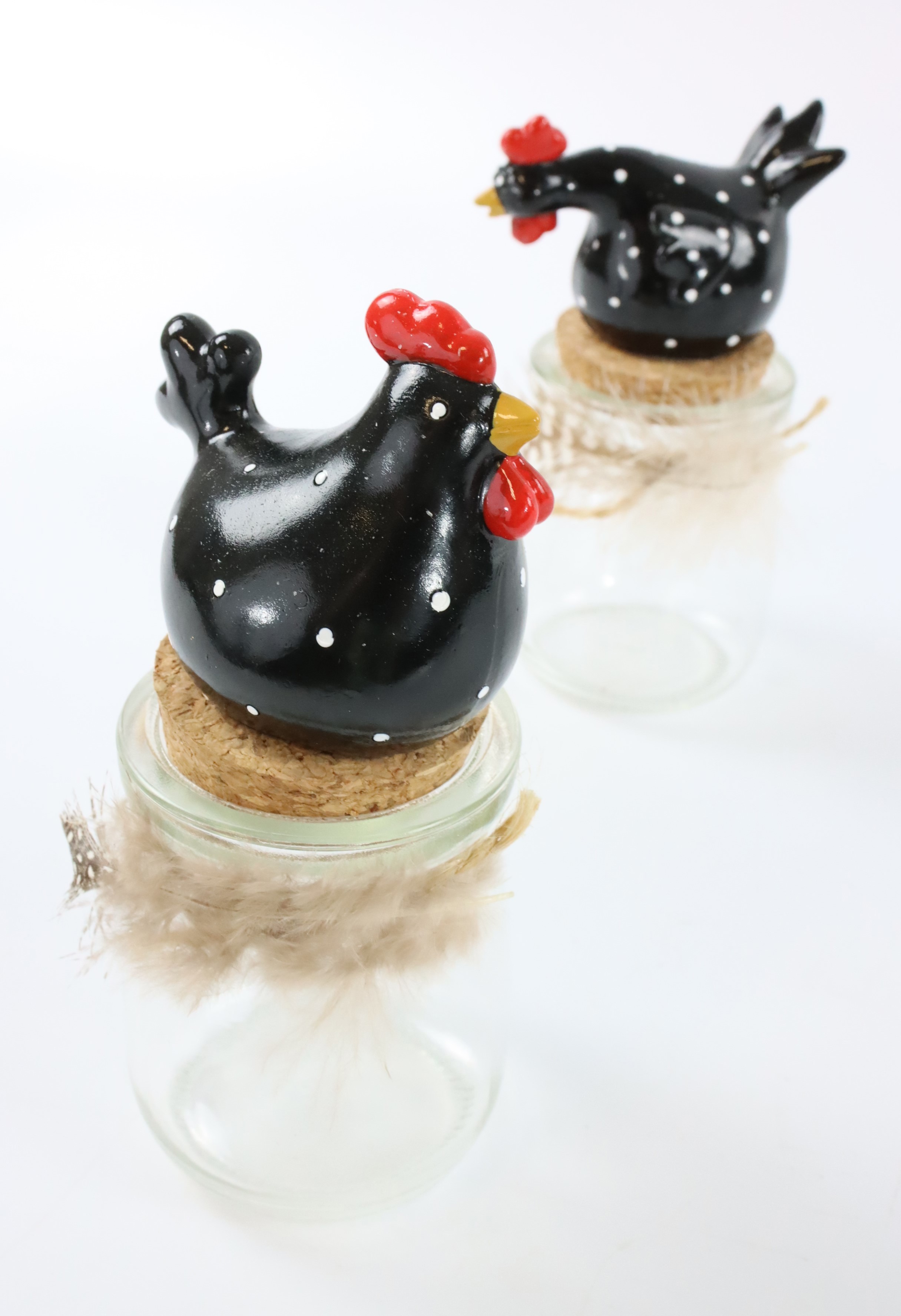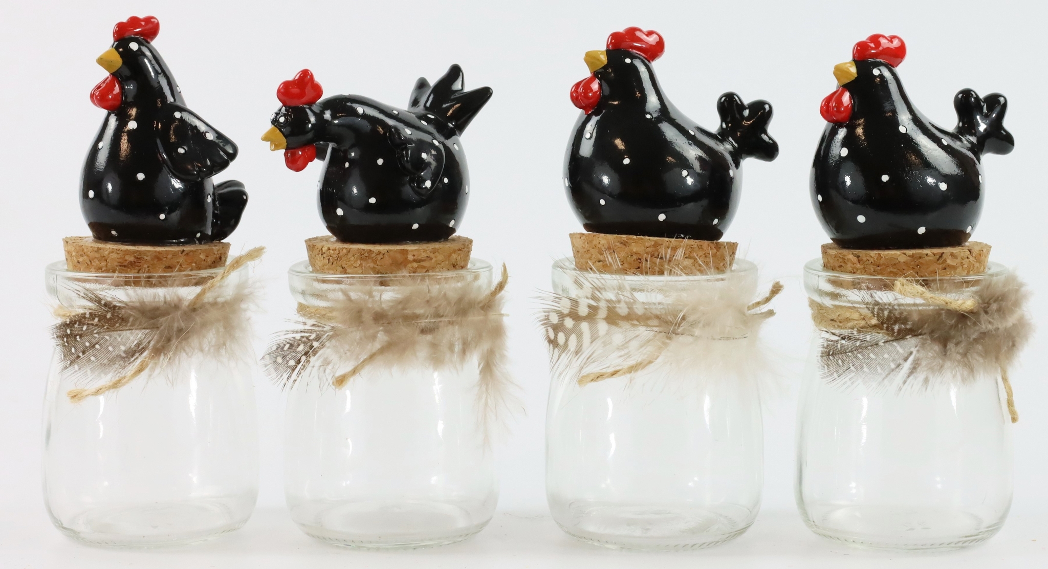 Discover the exceptional "Clucking hens" glass jar set, specially designed for the Easter season to add an appealing and stylish touch to your retail shop. This set consists of four charming glass jars designed as black hens and made from high-quality materials such as glass and polyresin. With a height of approx. 14 cm each, these decorative jars offer a unique way to present small treats or seasonal decorations in style.