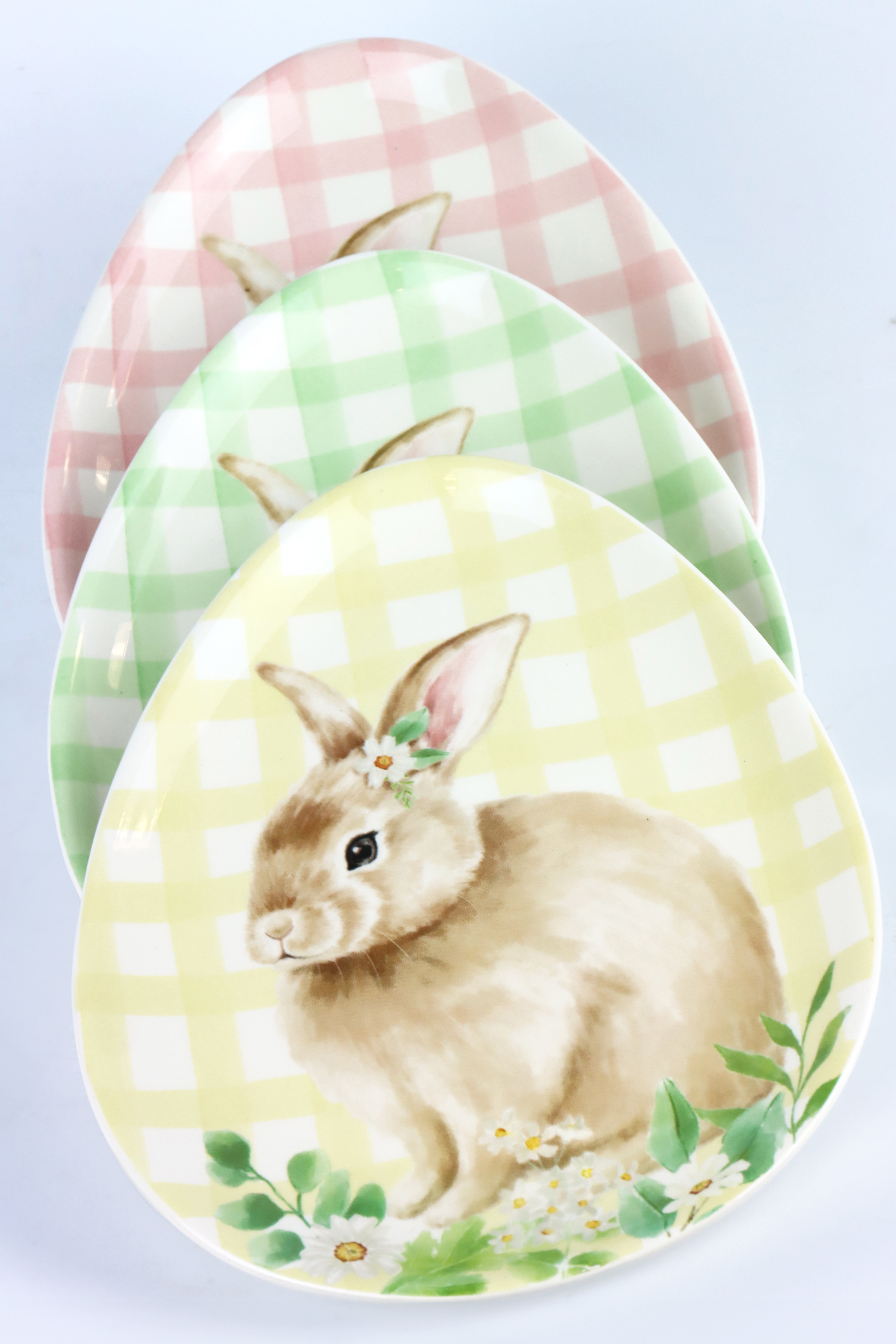 - Three beautiful plates in a unique egg shape with a rabbit motif