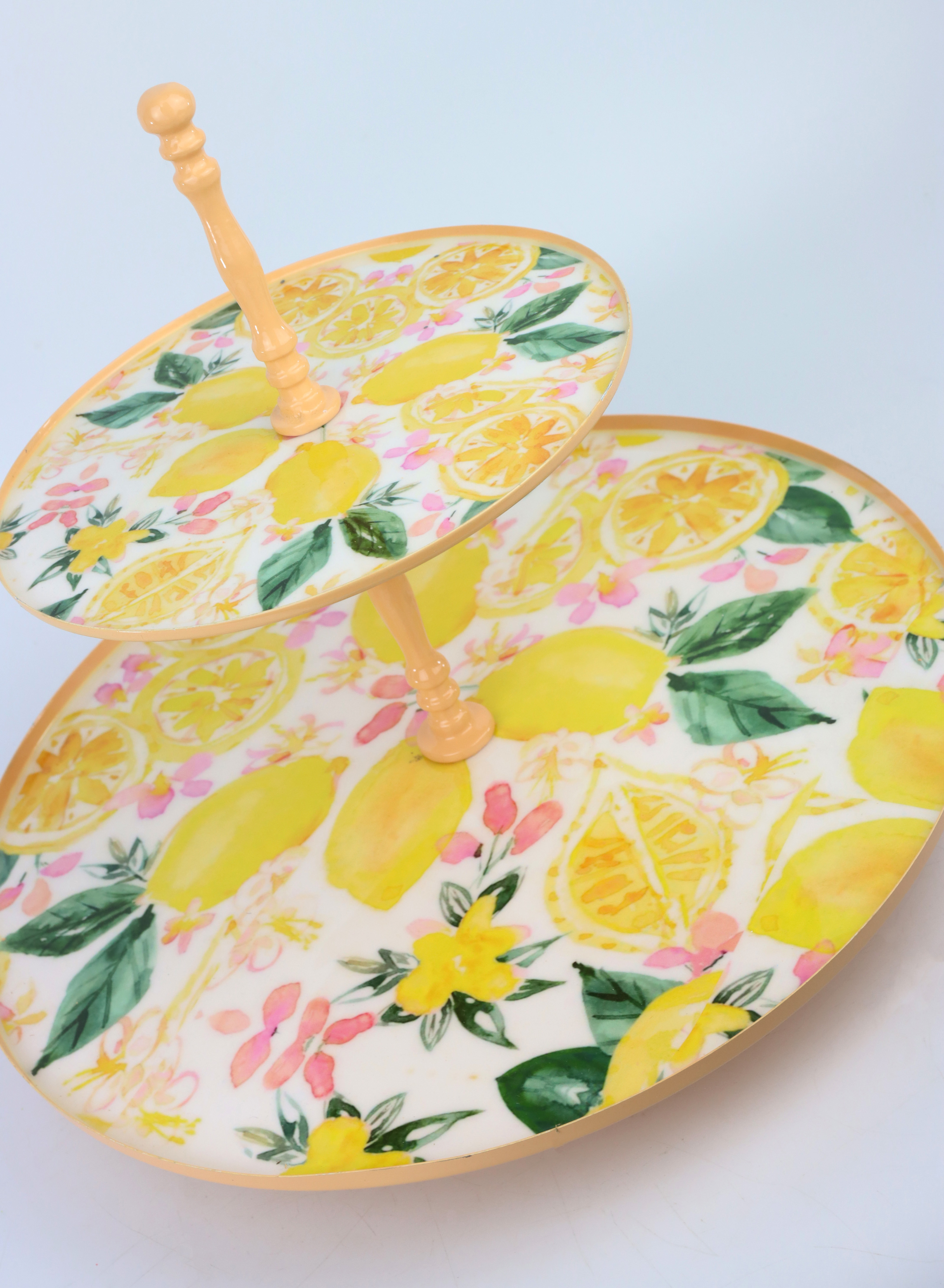 Our "Limone" etagere is specially designed for the spring/summer season and, with its fresh lemon design, brings vibrancy and colour to any setting, be it a living room at home or an elegant shop. The etagere has a diameter of around 40 cm, making it the ideal presentation surface for all kinds of products, whether decorative candles, small potted plants or handmade ceramic items.