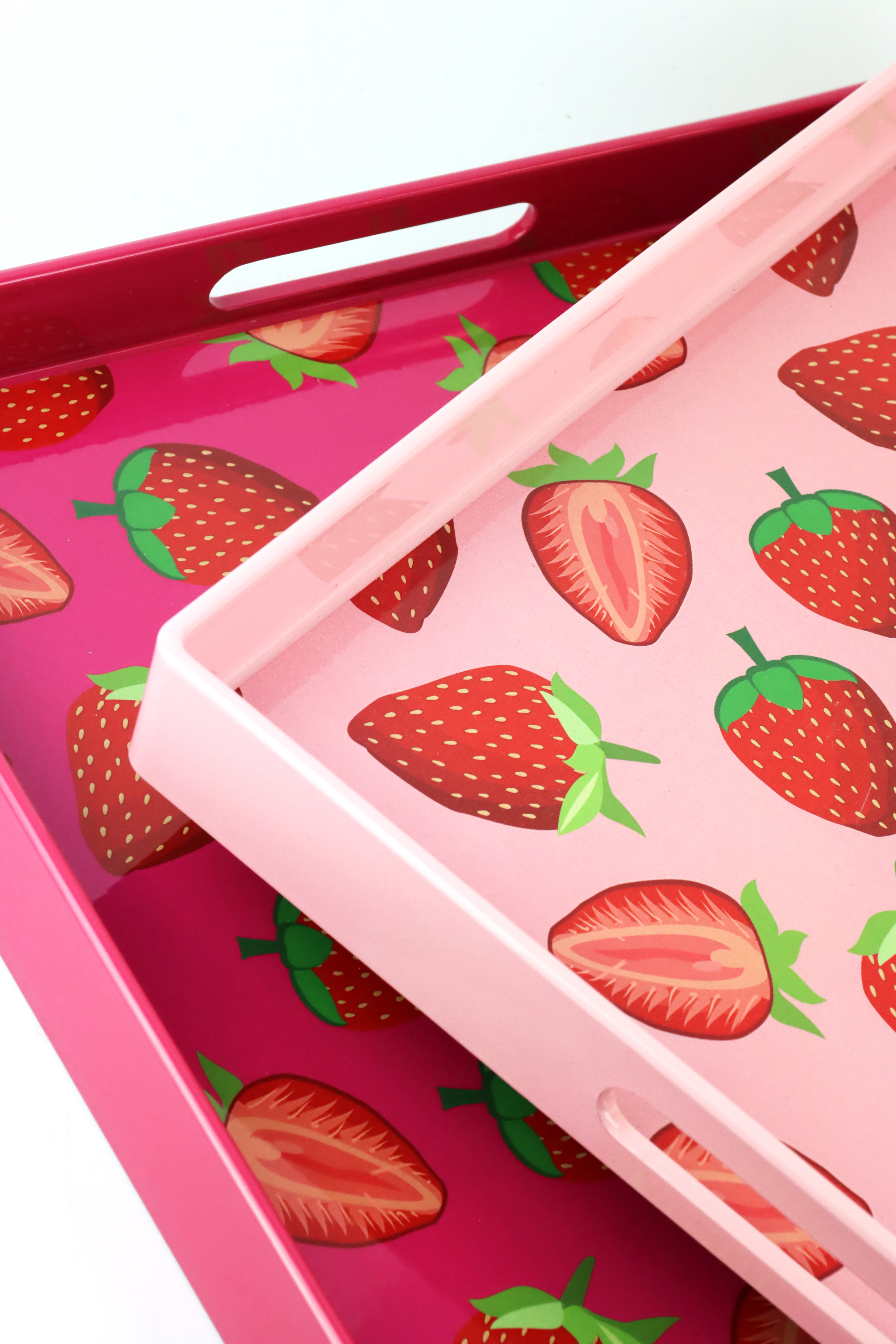 The cheerful strawberry print brings the lightness and freshness of the warmer seasons to any room. The bright colours and detailed design appeal particularly to those customers looking for stylish and unique decorating solutions. With its combination of design and functionality, this tray set appeals specifically to the modern, style-conscious consumer who values high quality.