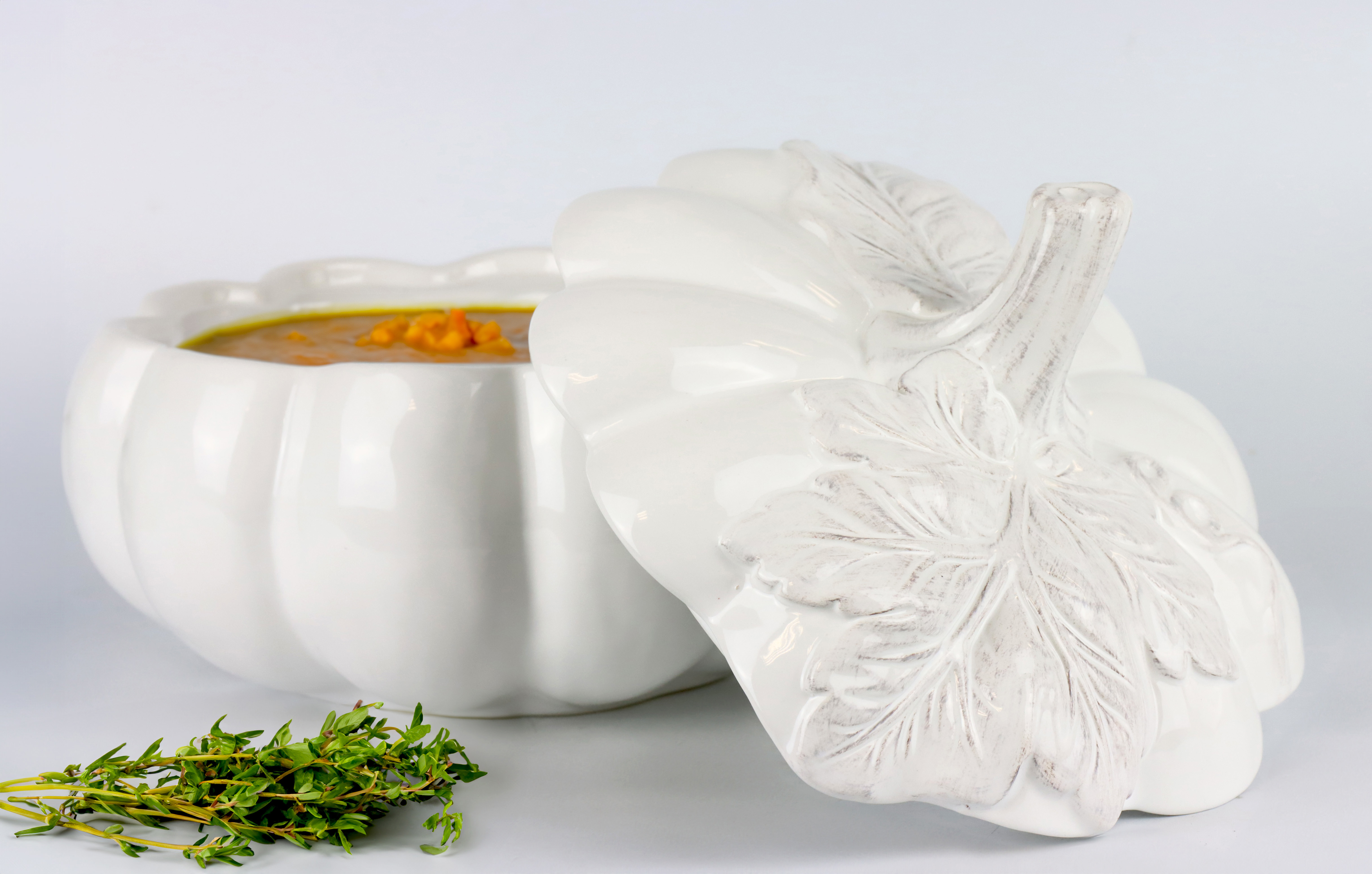 It impresses with its expressive design: a white pumpkin adorns the tureen and is the absolute highlight. The finely crafted details of this handmade tureen give it an individual, artistic charm. It radiates a naturalness and elegance that enriches any decor.