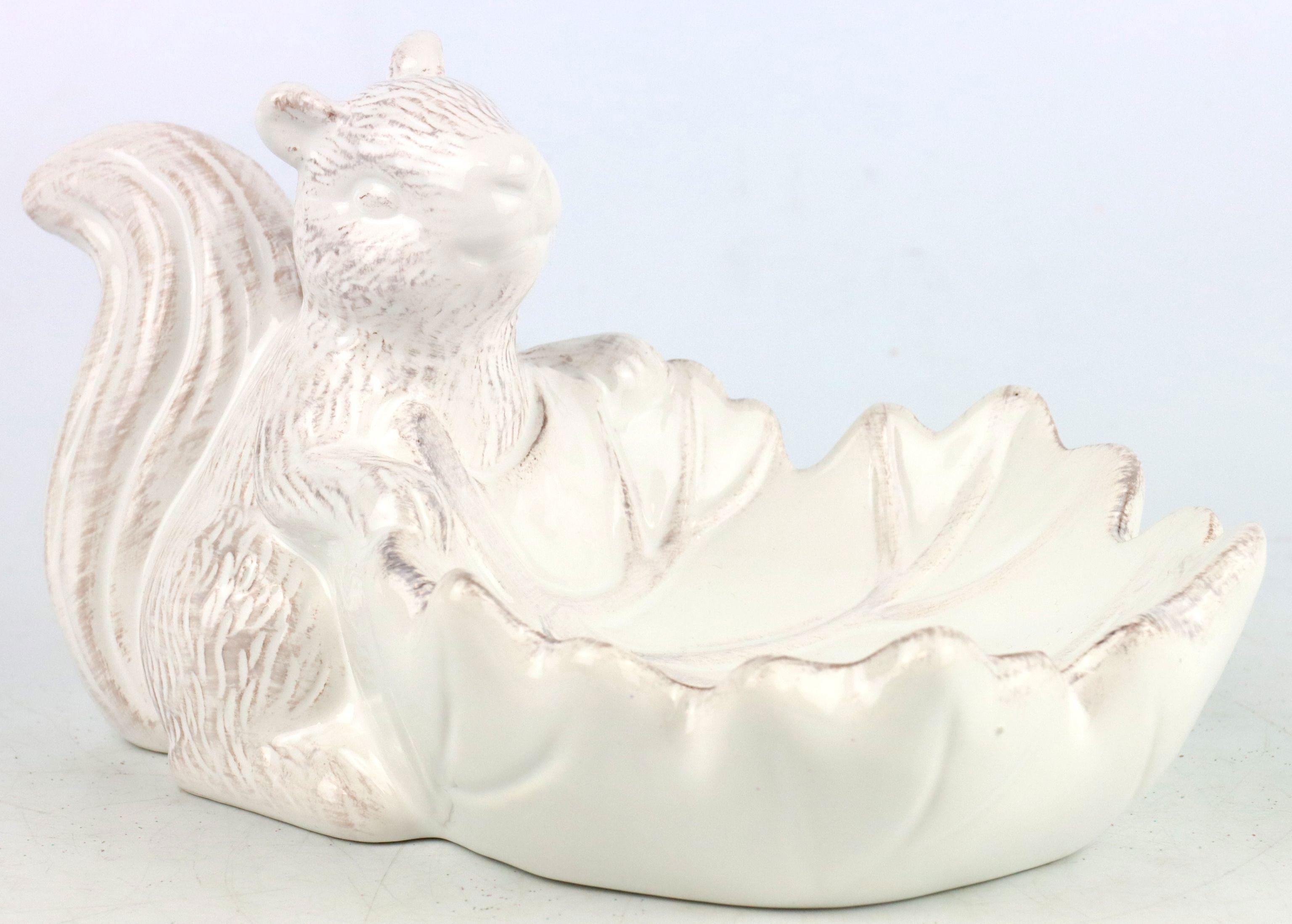 The "Sassy Squirrel" leaf bowl is a product from item number 8215. Made from high-quality white ceramic, the motif of a charming squirrel is the eye-catching feature of this unusual decorative item. With its compact dimensions of approx. 21 cm, the decorative object blends harmoniously into any interior and yet sets impressive accents.