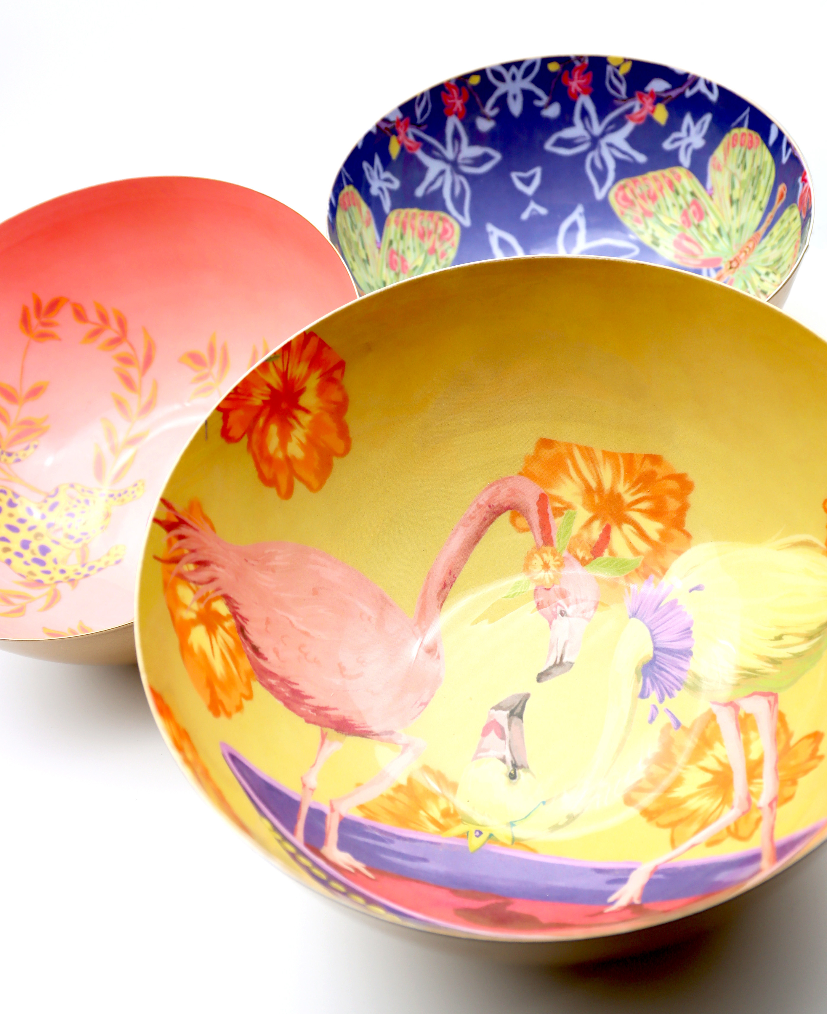 The "Asian Fauna" bowl set, consisting of three artistically designed bowls, impresses with its harmonious colour scheme in coral, blue and yellow, complemented by elegant golden accents. Made from high-quality metal, this set not only offers an attractive look, but also durability and robustness - ideal for everyday use or special occasions.