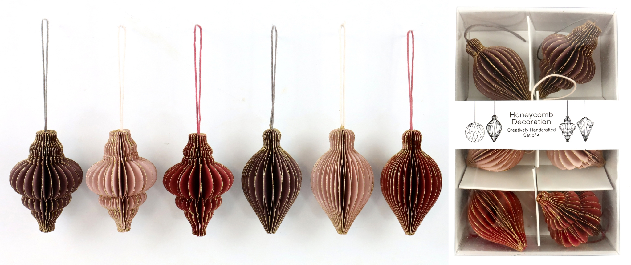 ENDiscover our festive ornament set "Honeycomb", item number 1291, which includes six paper ornaments in bright red that will add a modern yet traditional touch to your Christmas decorations. With their invigorating shape and colour, they are the perfect decoration for any Christmas tree or seasonal display.