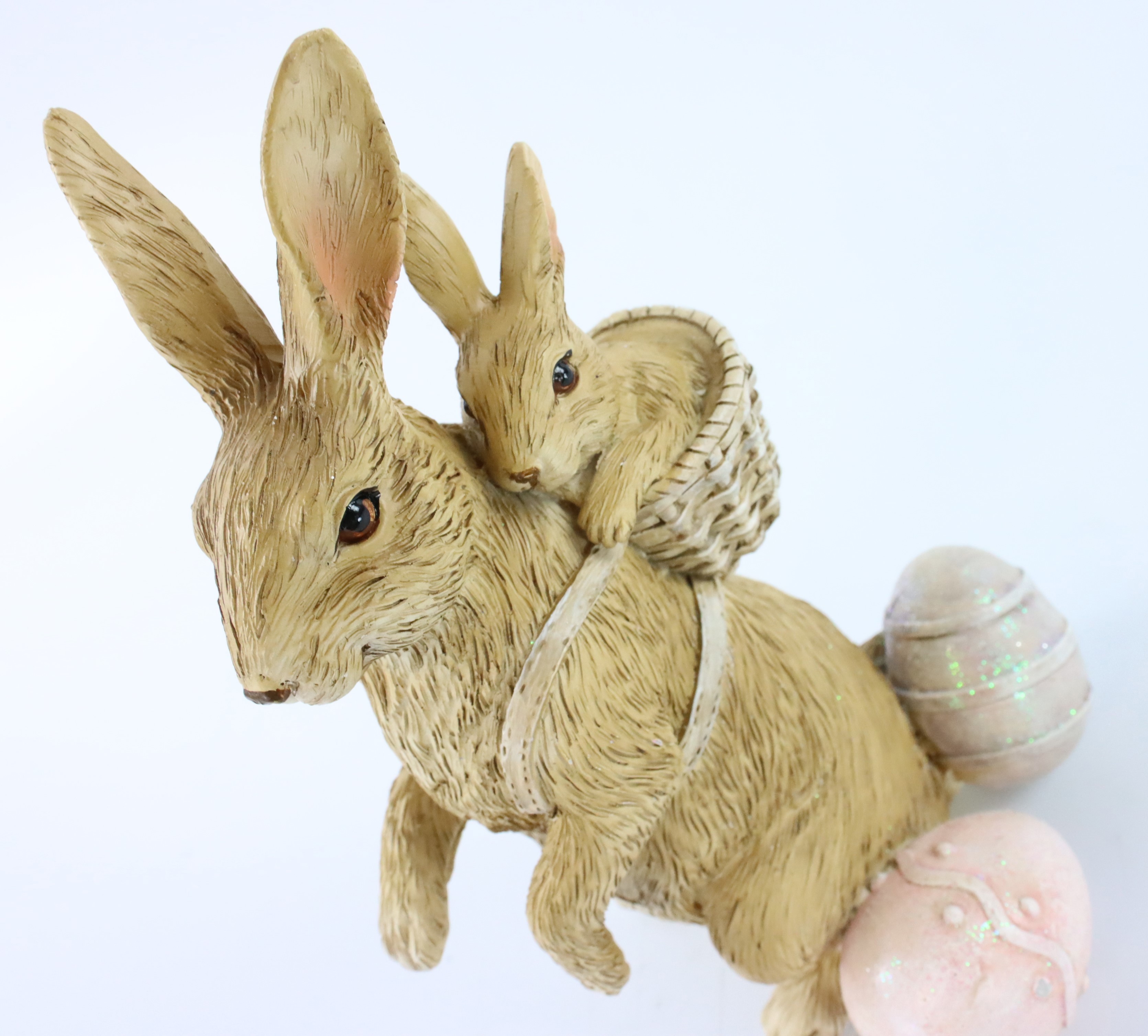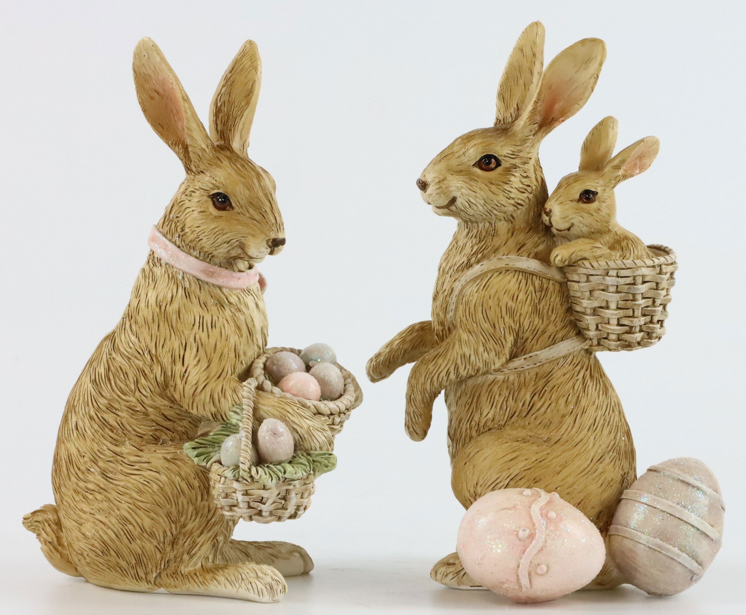 Discover our charming "Vintage Easter" bunny set, which has been specially developed for your Easter assortment in stationary retail. This delightful 2-piece set brings nostalgic charm to Easter decorations and is sure to catch the eye of your customers. Each element of this set is made of high-quality polyresin and measures approx. 15.5 cm in height. The fine workmanship and attention to detail of the rabbit figurines blend seamlessly into any living environment and add a touch of vintage.