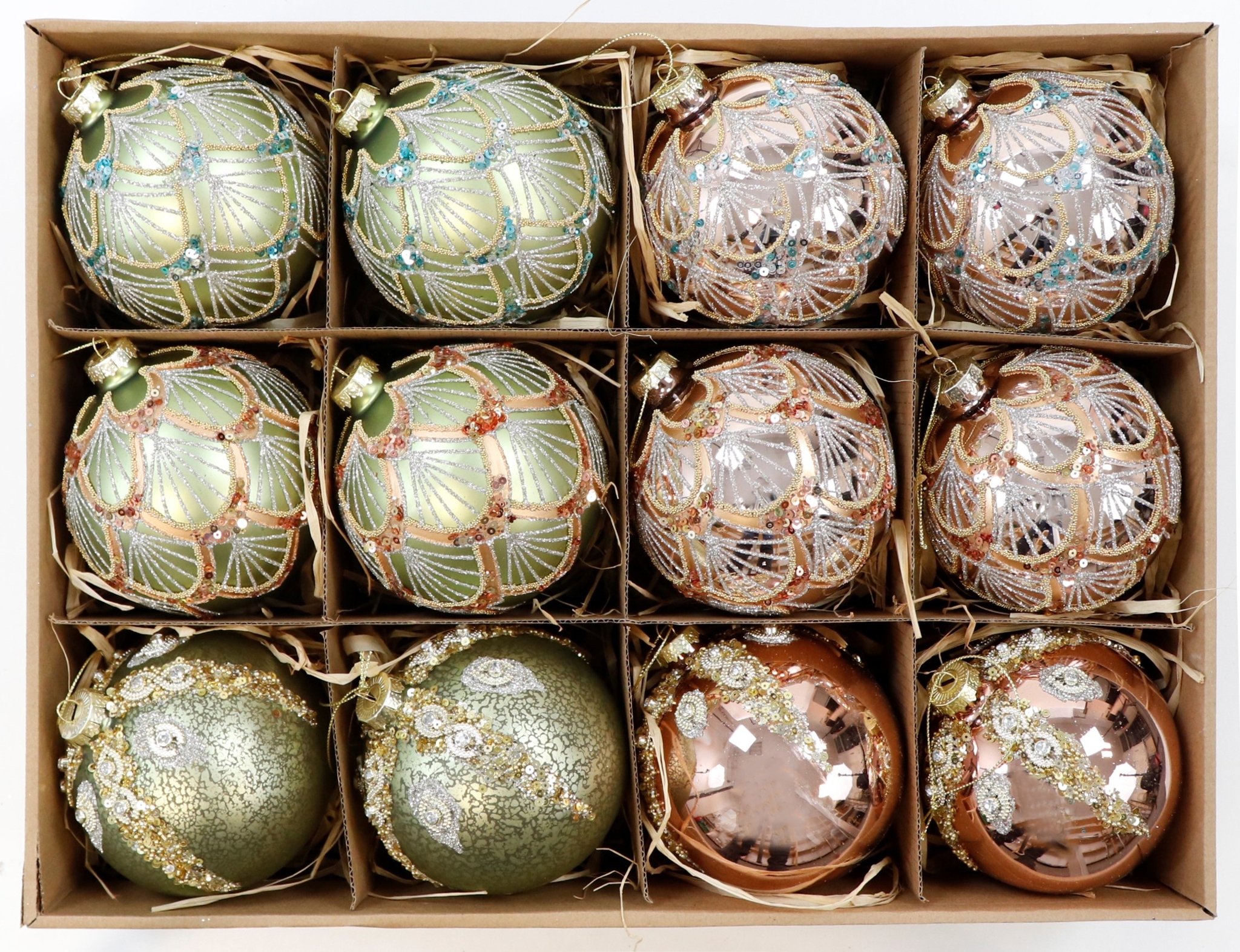 - Description: 12-piece set of glass baubles in green and brown approx. 10 cm in vintage box.