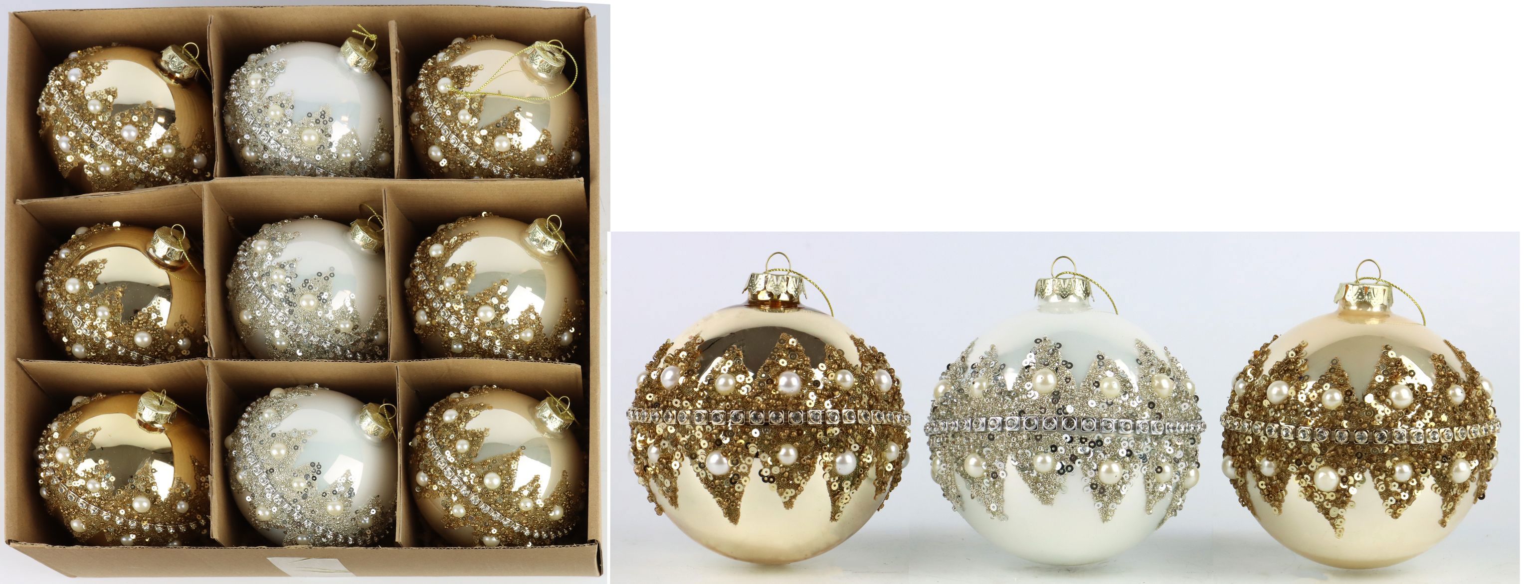 Add a touch of luxury and elegance to your seasonal range with our exclusive "Opulent Glow" glass bauble box. This 9-piece set consists of carefully crafted glass baubles in precious gold and silver, decorated with sparkling sequins to make any Christmas ambience shine in all its splendour. Ideal for bricks-and-mortar retailers in the home and lifestyle sector, this attractive box has everything your customers need for a stylish and festive decoration.