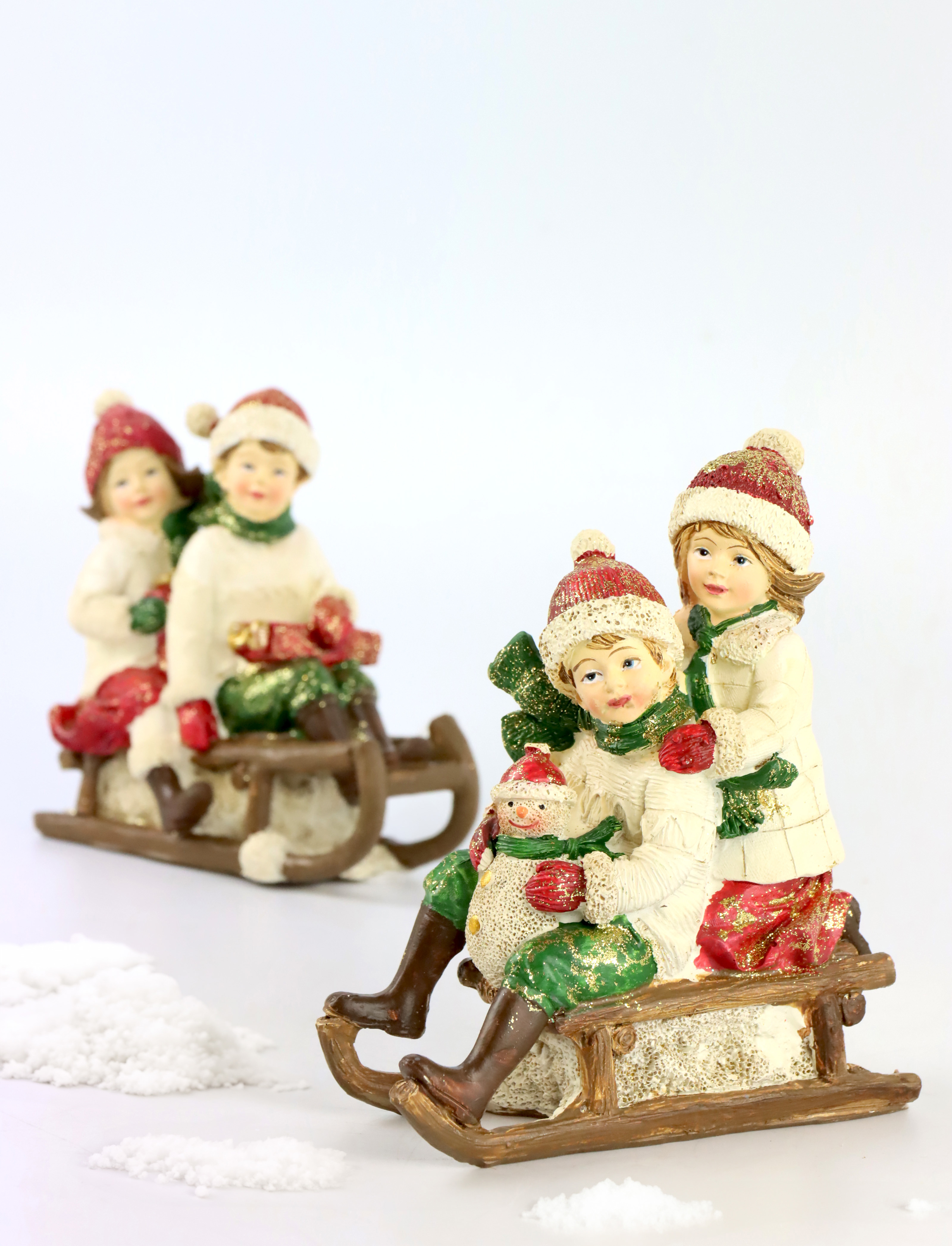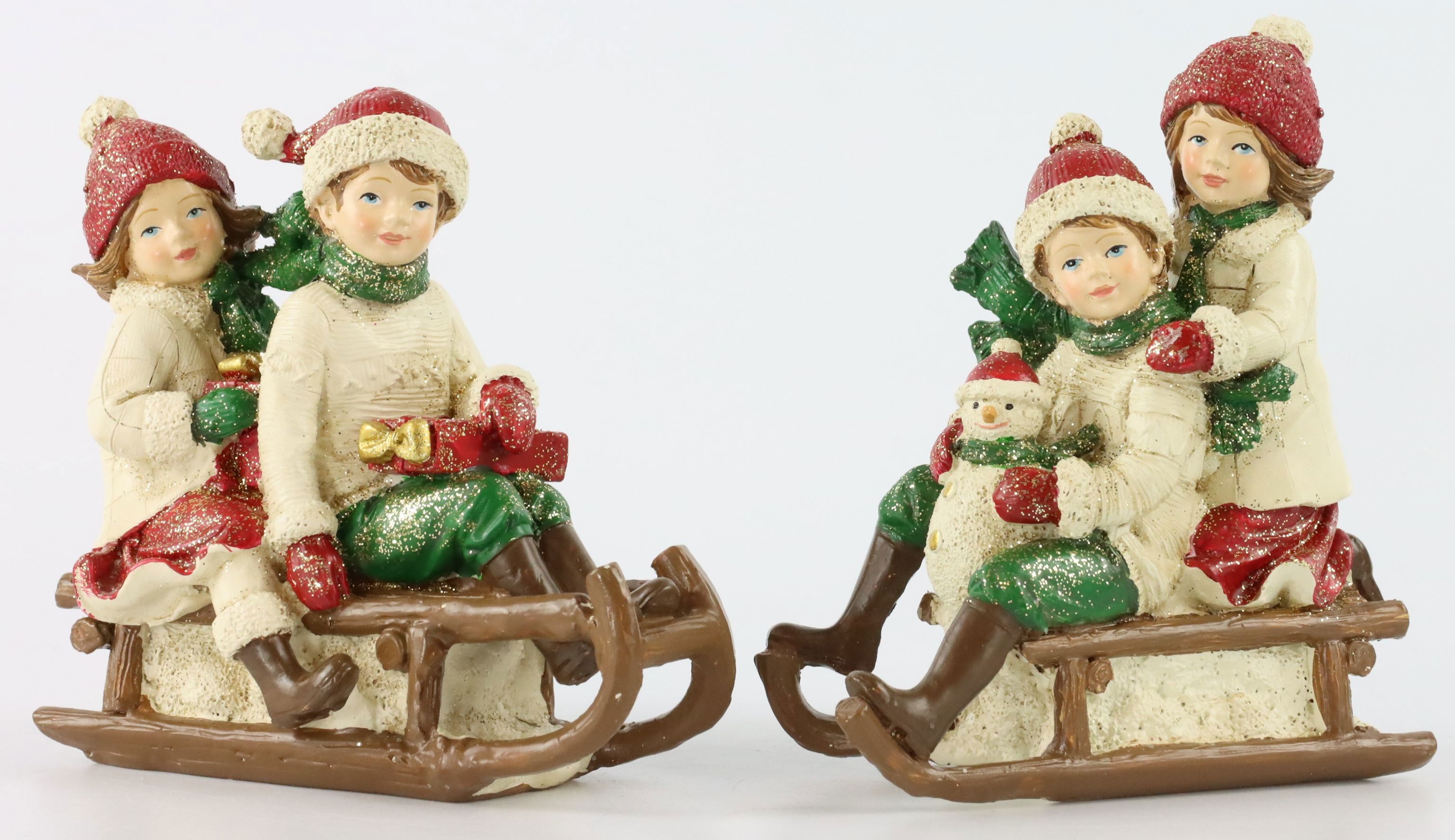 The figures are made of durable polyresin, a material that impresses with its robustness and attention to detail. Each figurine is approx. 12.5 cm tall and therefore adds a charming accent to any decoration. The figurines depict two children happily sledging in the snow. The lovingly designed faces and detailed clothing of the figures almost bring them to life.