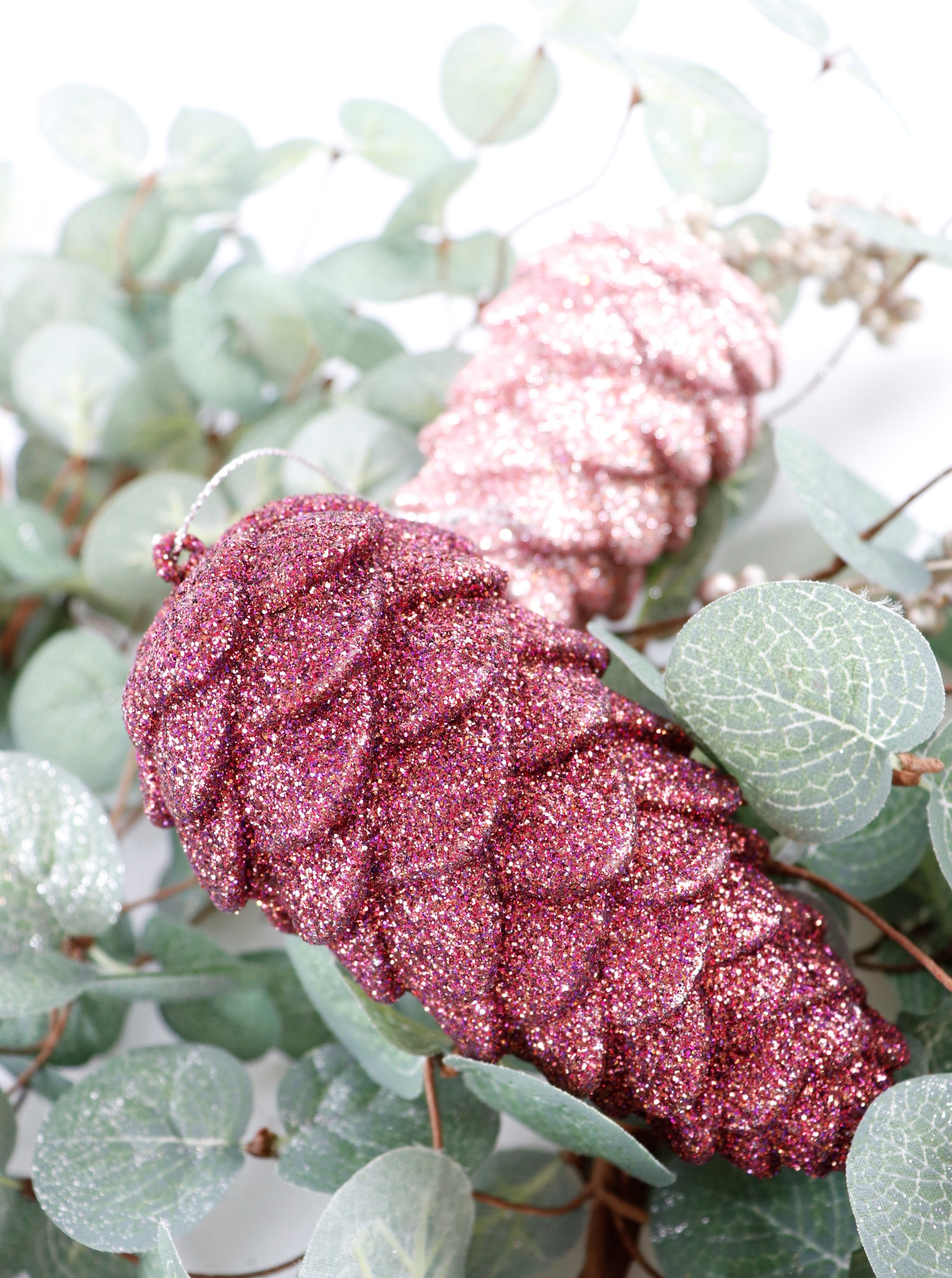 With a size of around 13 cm, the "Glory" glitter cones are an eye-catcher in any room and can be placed in many places thanks to their practical hanging device. For example, you can display the pendants on your Christmas tree branches or give your window a festive flair by attaching the cones. The cones even cut a fine figure as table decorations or in a Christmas bouquet. Their sparkling surface reflects the light and allows the colours pink, bordeaux and brown to shine in the Christmas lights.