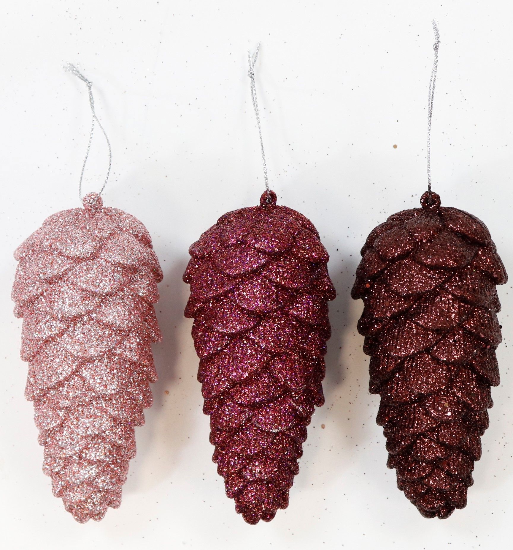 ENWith its set of three pendants in the colours pink, bordeaux and brown, the "Glory" glitter cone offers an ideal decoration option for the Christmas season. Made from polystyrene and covered with sparkling glitter, this piece of jewellery impresses with its look and high-quality workmanship.