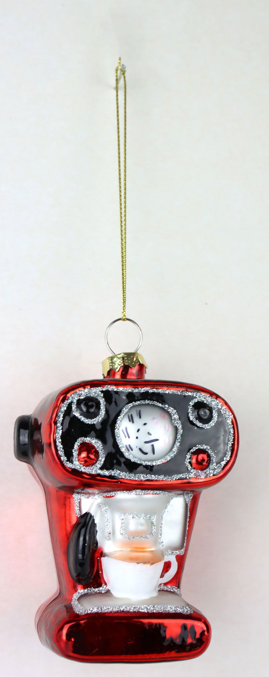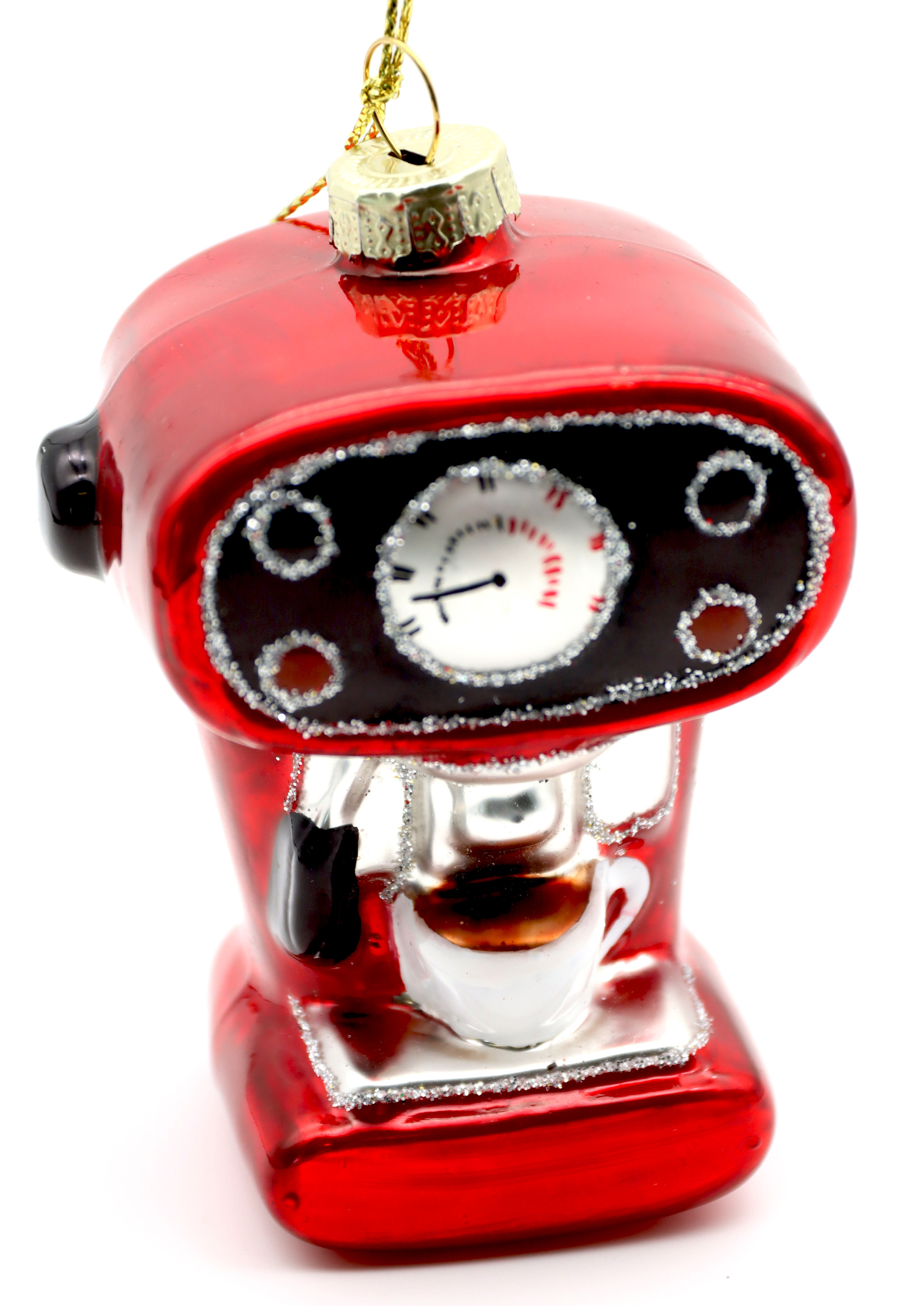 ENDiscover the festive elegance of the "Espresso machine" glass ornament in bright red - a unique highlight for your Christmas tree! Our exquisite glass ornaments are not only eye-catching, but also an expression of style and exclusivity. Made from high-quality glass and designed with great attention to detail, this glass ornament pendant is the perfect addition to the festive ambience of your shop or display area. Specially designed for retail partners, our "Espresso Machine" glass ornament is a great way to expand your home and lifestyle product range during the festive season.