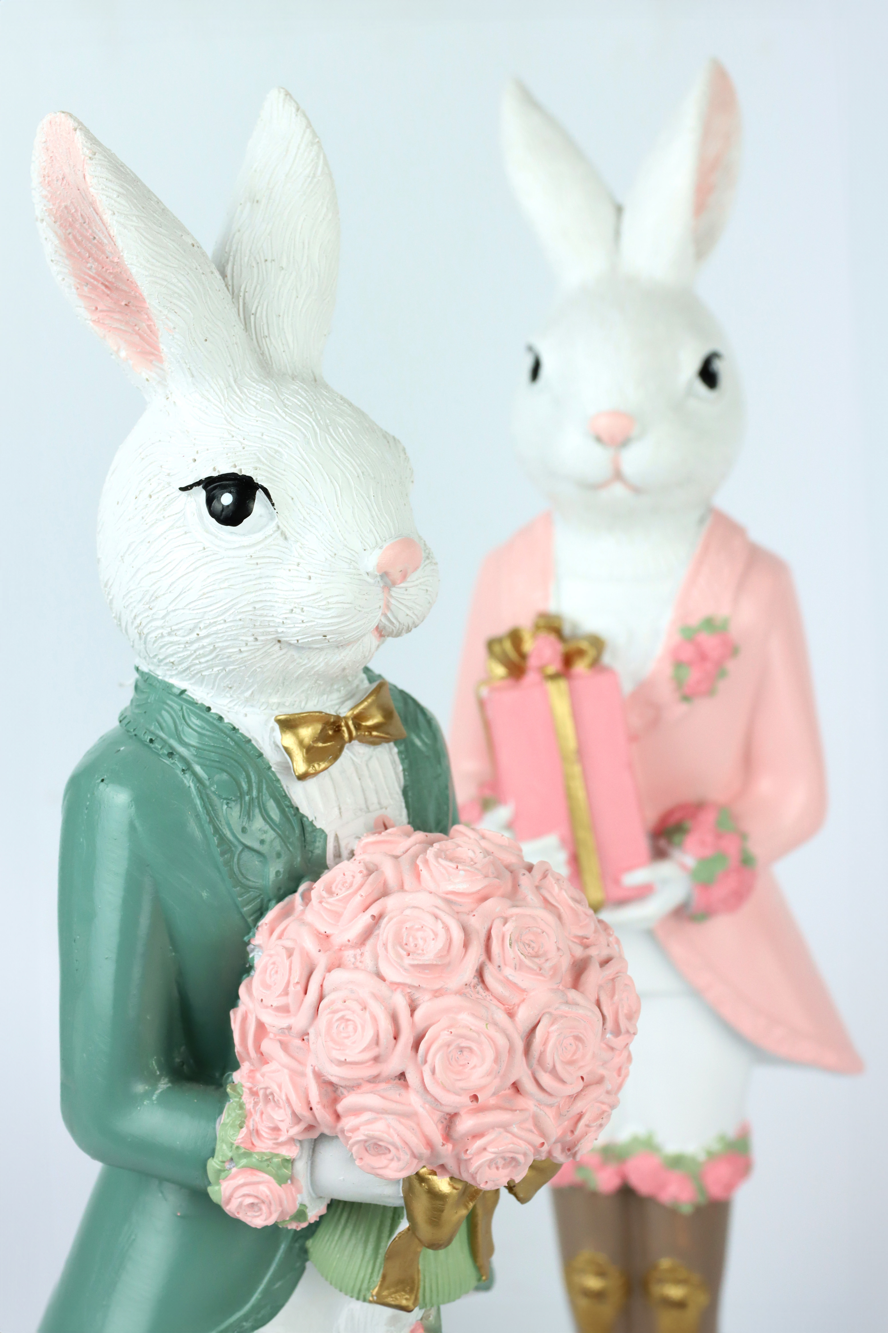The "WINDSOR" BUNNY FIGURES not only impress with their impressive size of approx. 32 cm, but also with their exquisite workmanship. Polyresin as a material guarantees a durable and resistant quality that will fully meet the demands of your customers even when used in shops for long periods of time. These rabbit figurines are not only eye-catching, but also an expression of elegance and tradition. This makes them a perfect fit for the home and lifestyle sector, which is particularly important to your retail customers.