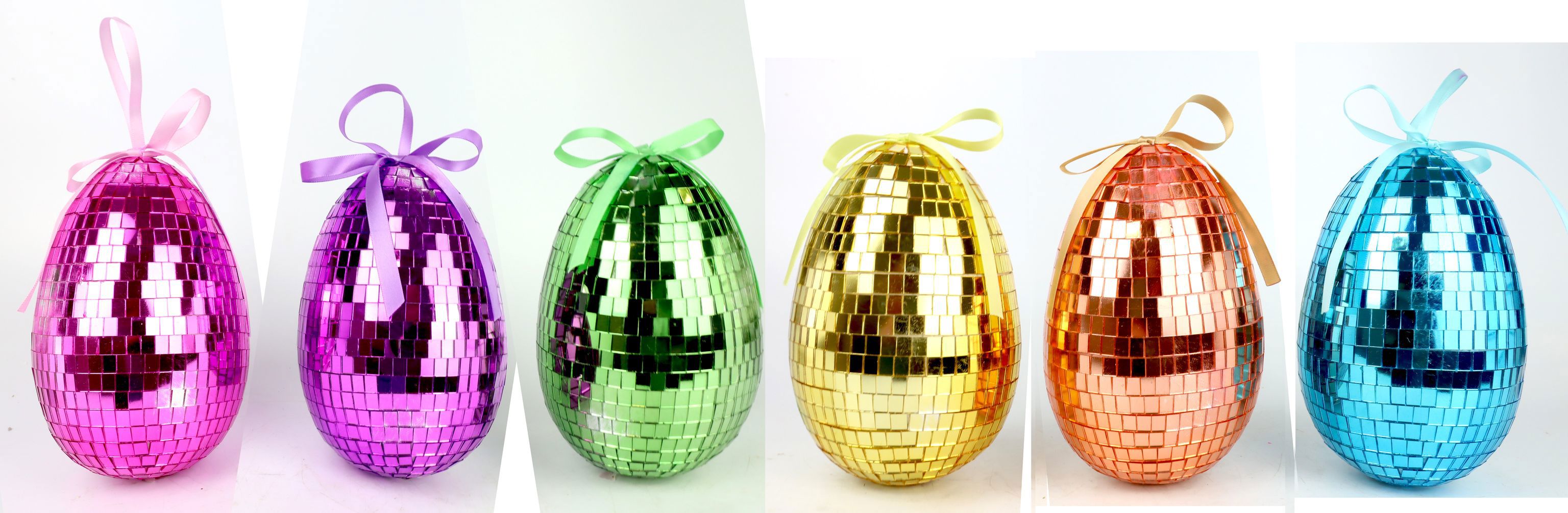 The set consists of six artistically designed mosaic eggs with mirrored surfaces in a vibrant palette of pink, purple, green, yellow, orange and blue. Each egg is approximately 17cm tall and made from high quality plastic, making them both lightweight and durable. The mosaic look reflects the light and creates a dazzling display that is a real eye-catcher in any shop window or retail space.
